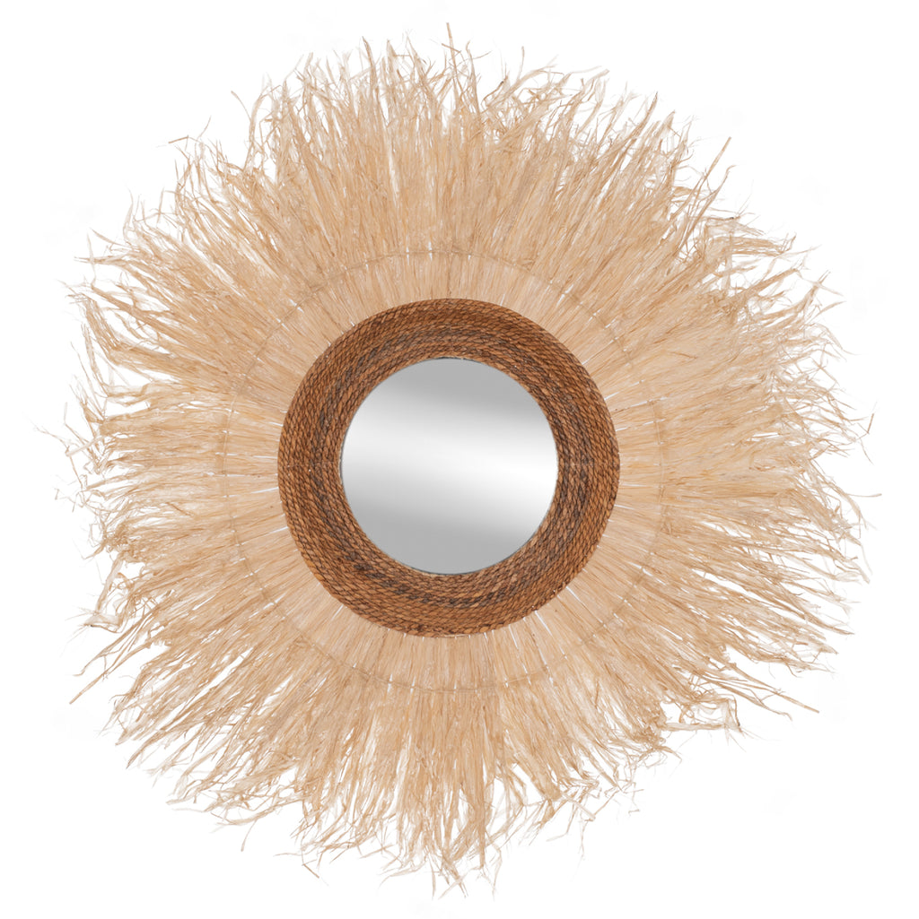 Кръглото огледало ΜΜ7744 е наистина специален предмет в декорацията на вашето пространство! Дизайнът му е красив и семпъл с рамка от влакна от сизал в естествен цвят. Декоративно огледало, което ще придаде различна естетика на вашето пространство и в същото време ще бъде красива опорна точка. РАЗМЕРИ: 110x4x110H см. (Φ110см.) Разстояние от стена: 4см. МАТЕРИАЛИ ЗА ИЗРАБОТКА: В допълнение към огледалото, рамката на огледалото в по-голямата си част е изработена от специално обработени сизалови влакна. Сизал (Agave sisalana) е вид цъфтящо растение, произхождащо от южно Мексико, но сега широко култивирано в много други страни. От листата му се получава твърдо влакно, което се използва за направата на въжета и различни други продукти. Терминът сизал може да се отнася или до общото име на растението, или до влакното, в зависимост от контекста. Сизаловото влакно традиционно се използва за въжета и канап и има много други приложения като хартия, плат, обувки, шапки, чанти, килими, геотекстил и т.н. Използва се също като армировъчно влакно за композитни продукти от фибростъкло, каучук и бетон. ПОДДРЪЖКА: Необходимо е само почистване от прах и при необходимост почистване с влажна кърпа. ПРЕДИМСТВА: Огледалото MH7744 е впечатляващо на външен вид и пленява всеки, който го погледне. Той е идеален за дома, но също така и за професионални пространства като хотели, Airbnb, зони за хранене като декоративен елемент и т.н. И разбира се следва най-новата тенденция в декорацията, която е използването на естествени и рециклируеми материали!