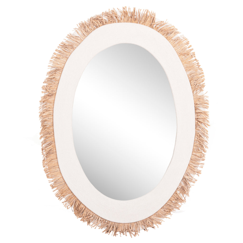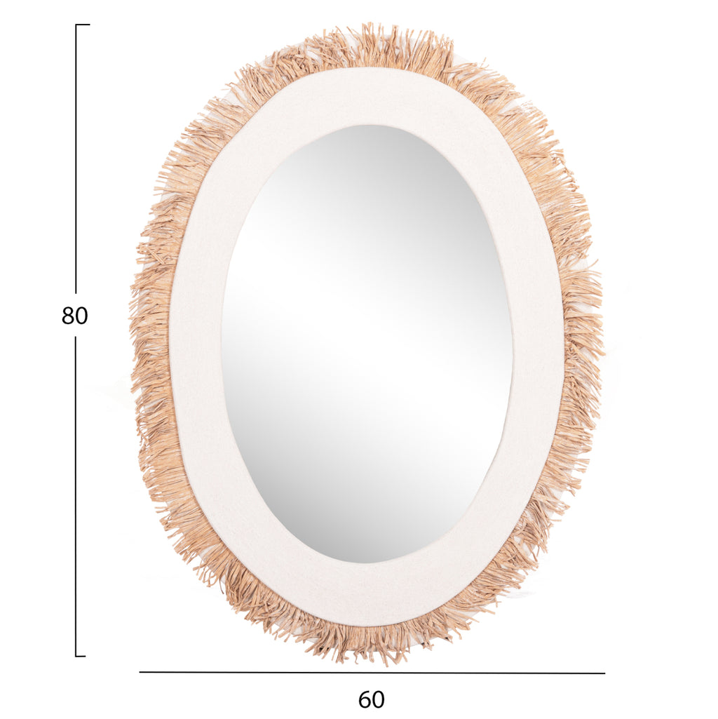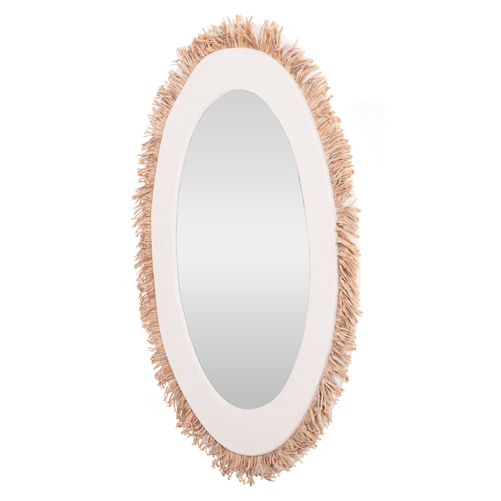 Огледалото SANTORINI е ръчно изработено стенно огледало с БЕЗБЯЛА рамка в овална форма, с БЕЖОВА акрилна трева като периферна декорация. Полезна декорация за всяко пространство, където имате нужда от огледало. Идеален да допълни по най-добрия начин декорация в стил "остров"! РАЗМЕРИ: Общо включително рамка: 60x2 (разстояние от стената)x80H cm. МАТЕРИАЛ НА ИЗРАБОТКА: Рамката на огледалото е изработена от MDF със сива циментова текстура, следваща най-новите тенденции в интериорния дизайн. MDF (влакна със средна плътност) е модерен материал за масово потребление с основните характеристики на абсорбиране на минимална влага, хомогенност на масата, задоволителни механични свойства, отлична гладкост и много възможности за обработка. ПОДДРЪЖКА: Достатъчно е редовно почистване на прах и забърсване с влажна кърпа, като можете да използвате и меки търговски почистващи препарати. ** Цветопредаването на продукта може леко да се различава от неговото фотографско представяне на вашия екран.