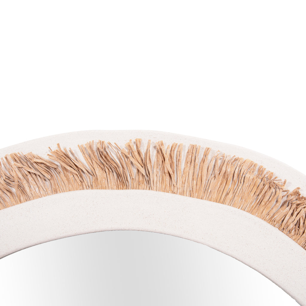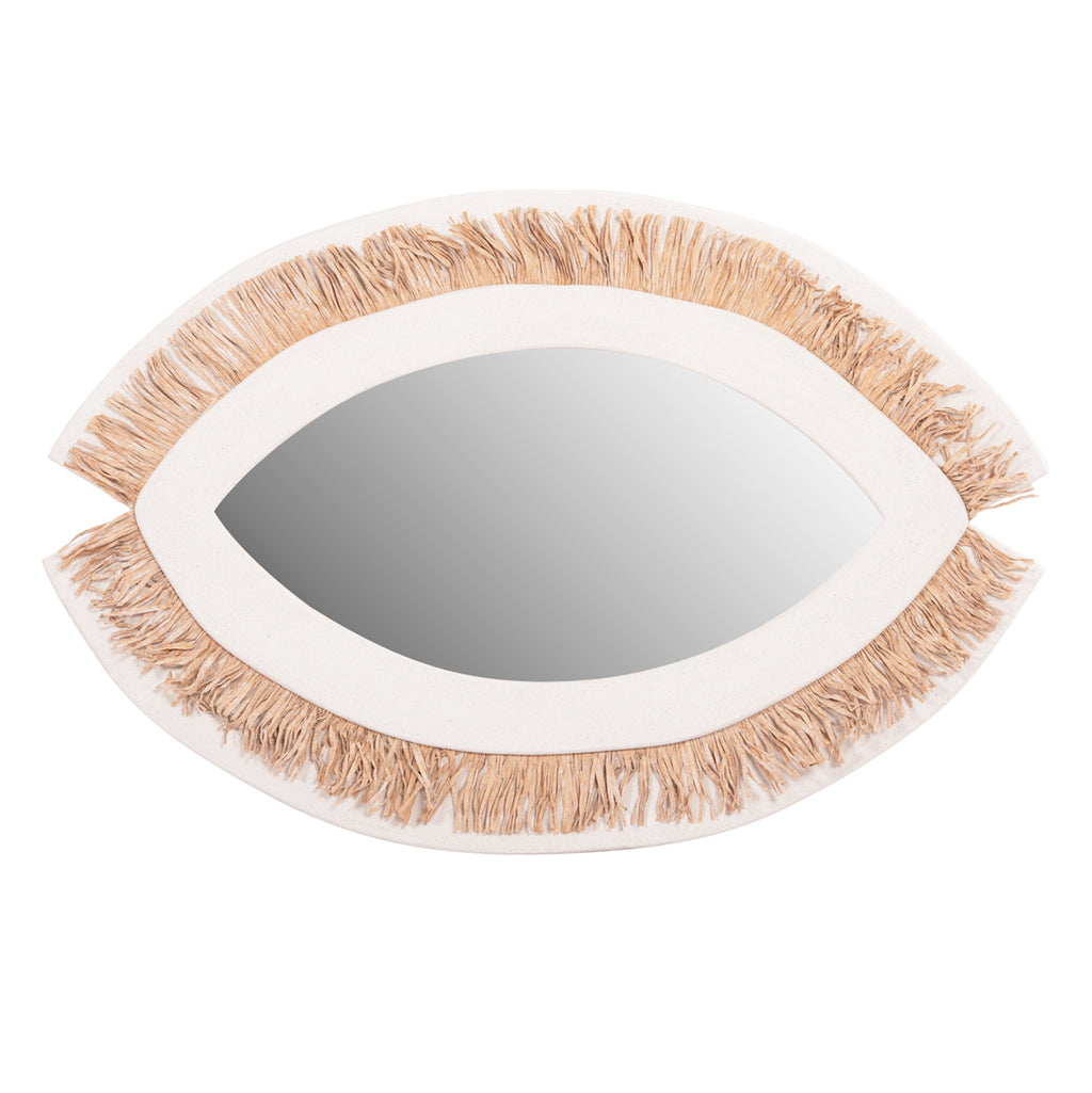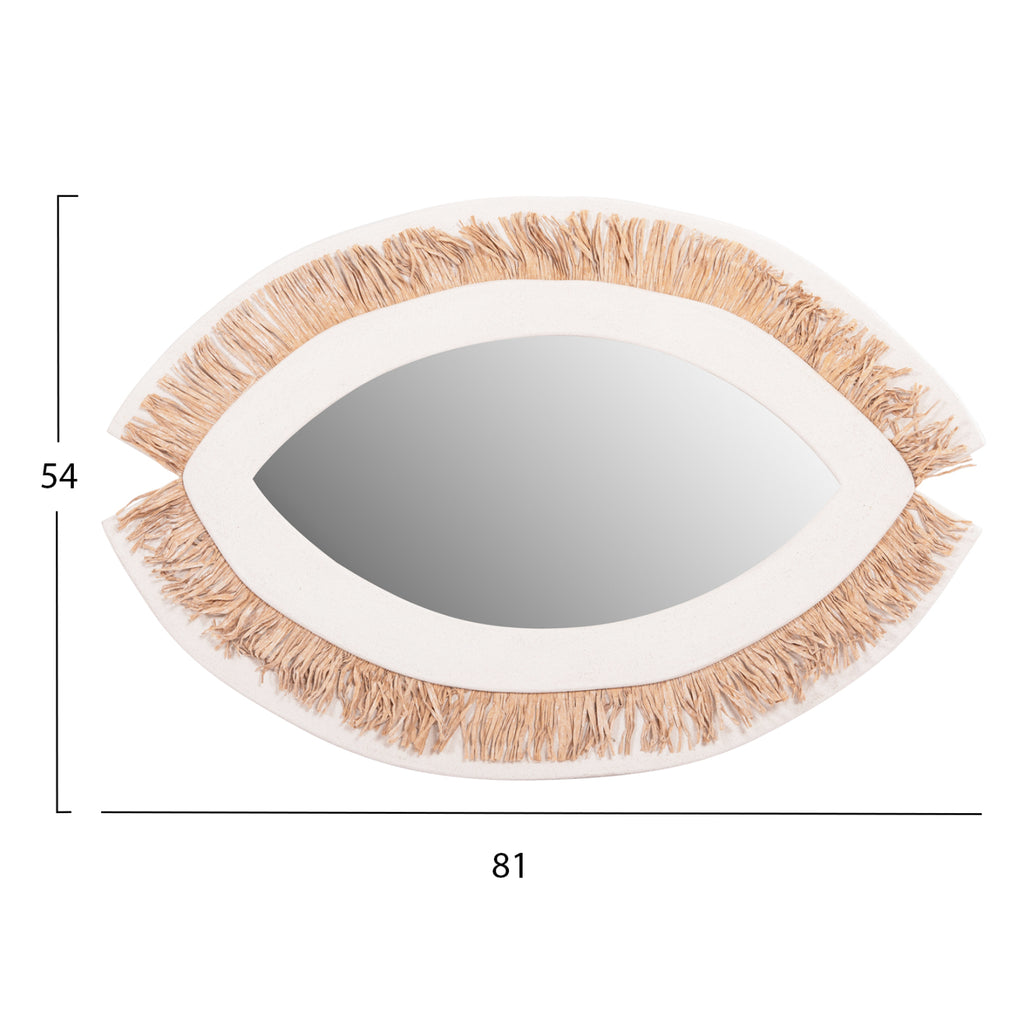 Огледалото SANTORINI е ръчно изработено стенно огледало с БЕЗБЯЛА рамка в красива форма, наподобяваща око, с БЕЖОВА акрилна трева като периферна декорация. Полезна декорация за всяко пространство, където имате нужда от огледало. Идеален за декорация в стил "остров"! РАЗМЕРИ: Общо включително рамката: 81x1.8 (разстояние от стената)x54H cm. МАТЕРИАЛ НА ИЗРАБОТКА: Рамката на огледалото е изработена от MDF с циментова текстура, което е най-модерната тенденция в областта на интериорния дизайн. MDF (влакна със средна плътност) е модерен материал за масово потребление с основните характеристики на абсорбиране на минимална влага, хомогенност на масата, задоволителни механични свойства, отлична гладкост и много възможности за обработка. ПОДДРЪЖКА: Достатъчно е редовно почистване на прах и забърсване с влажна кърпа, като можете да използвате и меки търговски почистващи препарати. ** Цветопредаването на продукта може леко да се различава от неговото фотографско представяне на вашия екран.