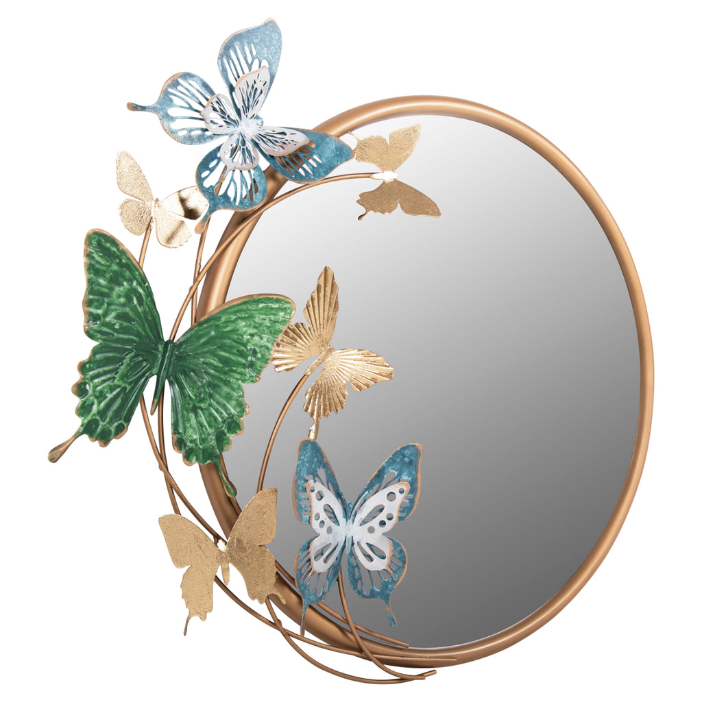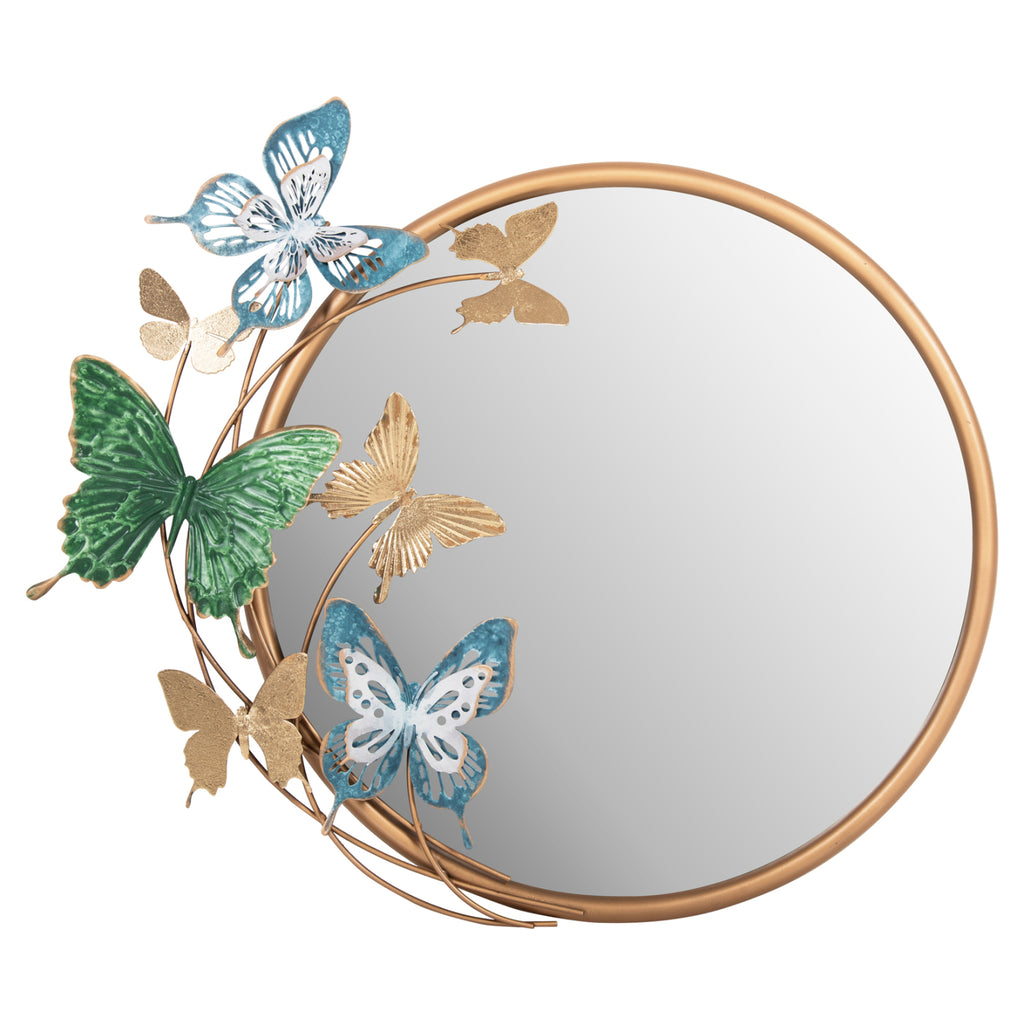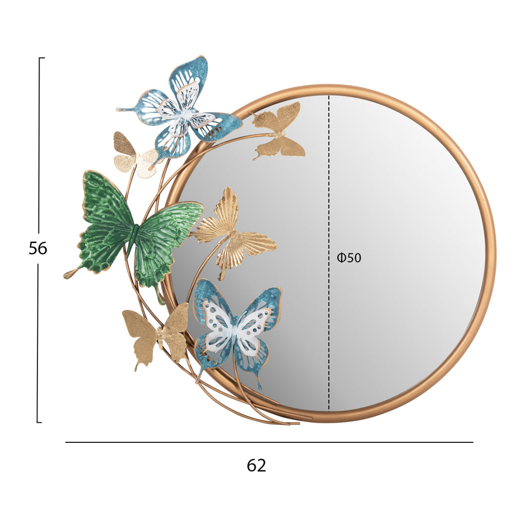 Това огледало е наистина красива част от декорацията на вашия дом! Представлява кръгло метално огледало със ЗЛАТНА рамка и фигурки на пеперуди в златно, зелено и синьо, което го прави и декорация за стена. По принцип огледалото е един от необходимите предмети за дома, но също така е идеално за хотели, Airbnb или места за хранене като декоративен елемент!