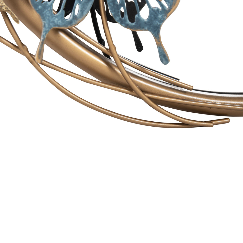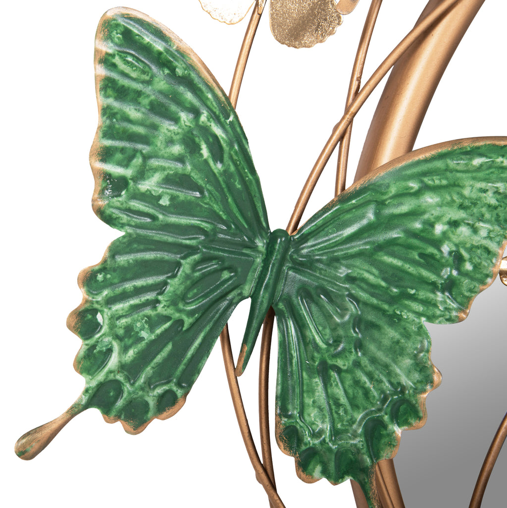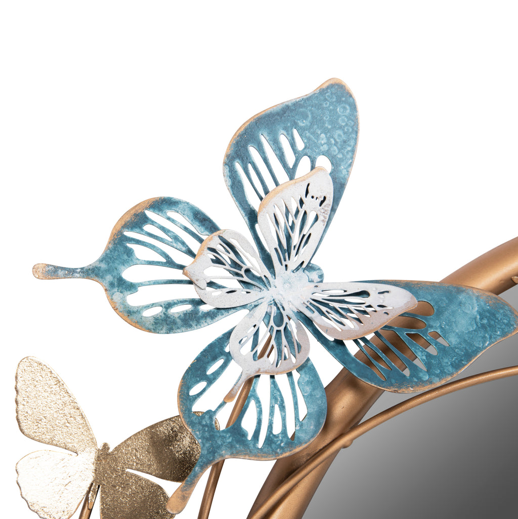 Това огледало е наистина красива част от декорацията на вашия дом! Представлява кръгло метално огледало със ЗЛАТНА рамка и фигурки на пеперуди в златно, зелено и синьо, което го прави и декорация за стена. По принцип огледалото е един от необходимите предмети за дома, но също така е идеално за хотели, Airbnb или места за хранене като декоративен елемент!