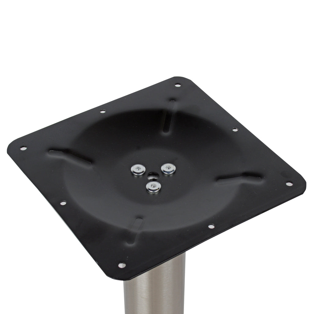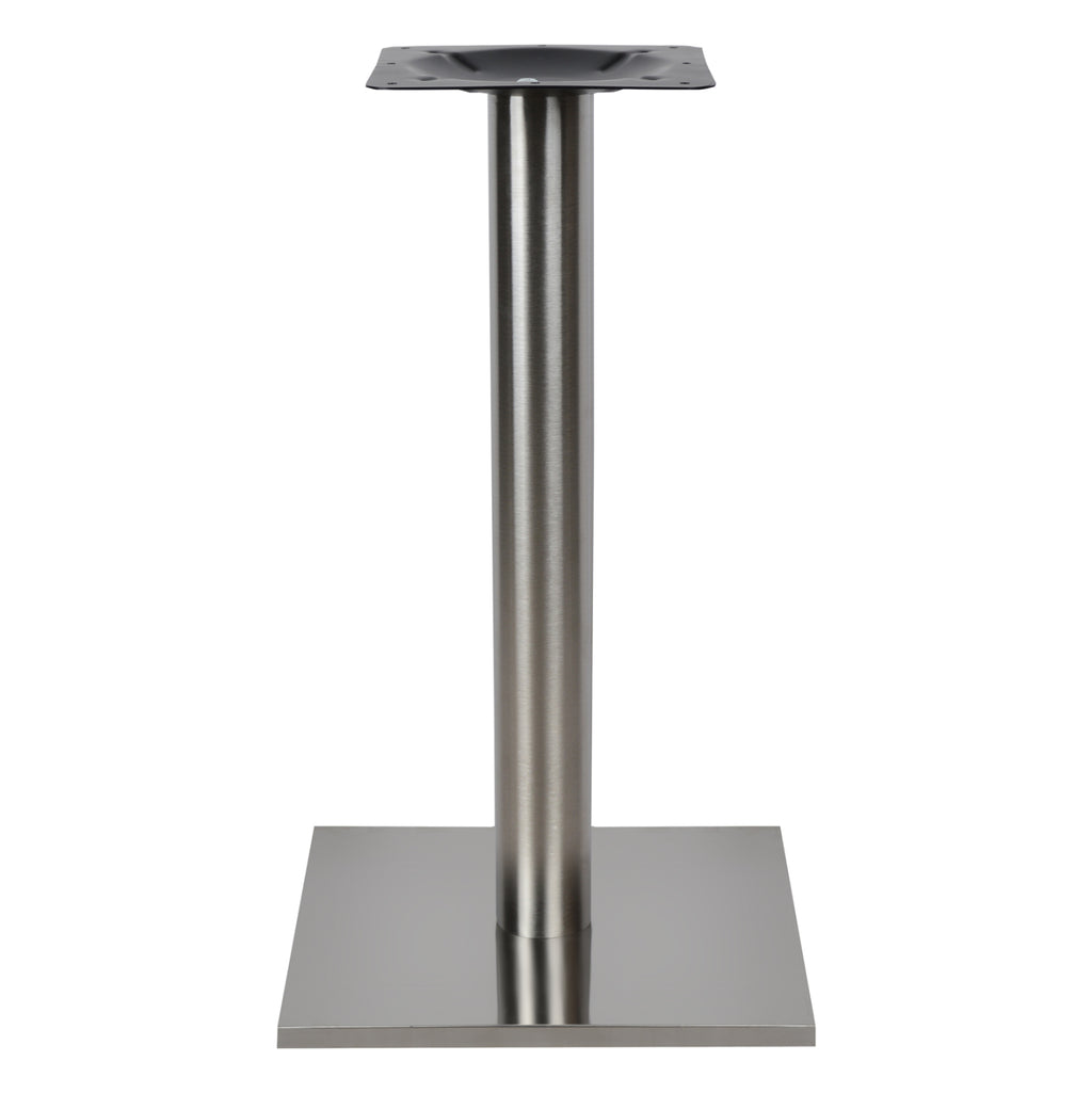 База за маса от инокс, с регулатори. Материал: Inox 201- Подходящ САМО за вътрешна употреба Размери на повърхността: 25x25 cm. Размери на основата: 40х40 см. Височина на основата: 72 см. Размери на тръбата: Φ7,6 см. Важна забележка Внимание: Винтовете за дърво, включени в опаковката за завинтване на капака, може да не са подходящи за избрания от вас капак. Винаги проверявайте височината на винта преди завинтване.