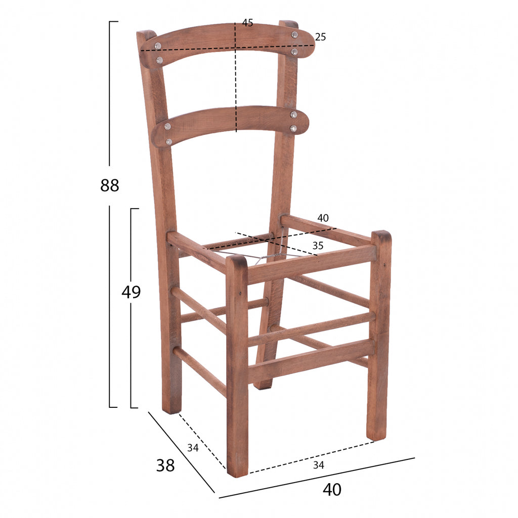 Кафе стол за тези от вас, които обичат традиционния стил и затова са го приели в професионалното си пространство. Кафе столът е красиво и вечно предложение, което ще ви впечатли. Рамката му е изработена от 100% масивна букова дървесина, импрегнирана е и е лакирана с външен италиански лак, който в комбинация с телта в рамката на краката предлага по-голяма здравина и устойчивост на време и влага. Процесът на импрегниране дава на дървото много години живот, тъй като го прави устойчив на износване, атмосферни условия и микроорганизми или буболечки, които го разяждат. Освен това му придава допълнителна здравина и при правилна поддръжка може да остане като нов дълги години. Седалката на стола може да бъде с плетена седалка (направена от естествена ракита), или с мека седалка (тапицерия от изкуствена кожа срещу допълнително заплащане). Стол, подходящ за бизнес помещения, за таверни, кафенета, но и като цяло за пространства, декорирани в класическия гръцки традиционен стил. Цвят: Продукт за импрегниране на орех Етапи на обработка: 1-ви етап: Един слой импрегниращ цвят. 2-ри етап: Повторете процеса на смилане. 3-ти етап: Един слой външен водно-восъчен лак за идеална издръжливост и естетически резултати на продукта. Размери: 40х38х88см. Размери на седалката: 40х35 см. Размери на гърба: 45х25см. Височина на седалката: 49 см. Височина на крака: 48 см. Разстояние между краката: 34х34 см.