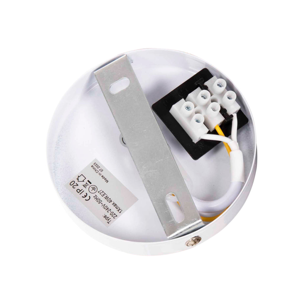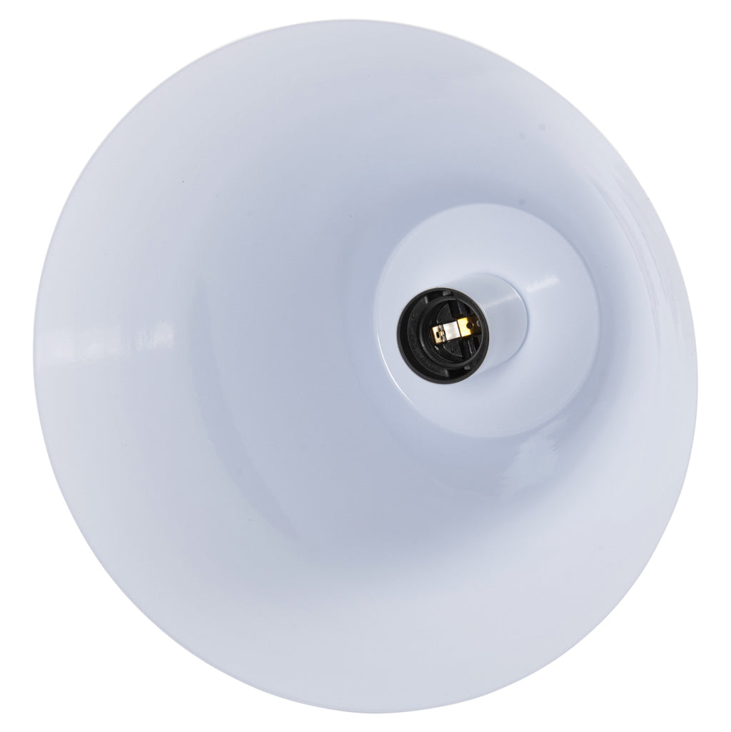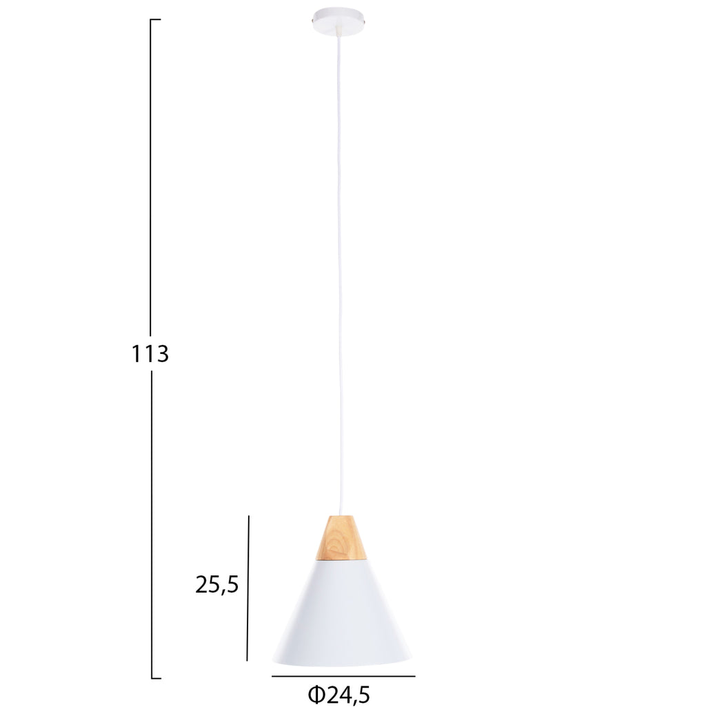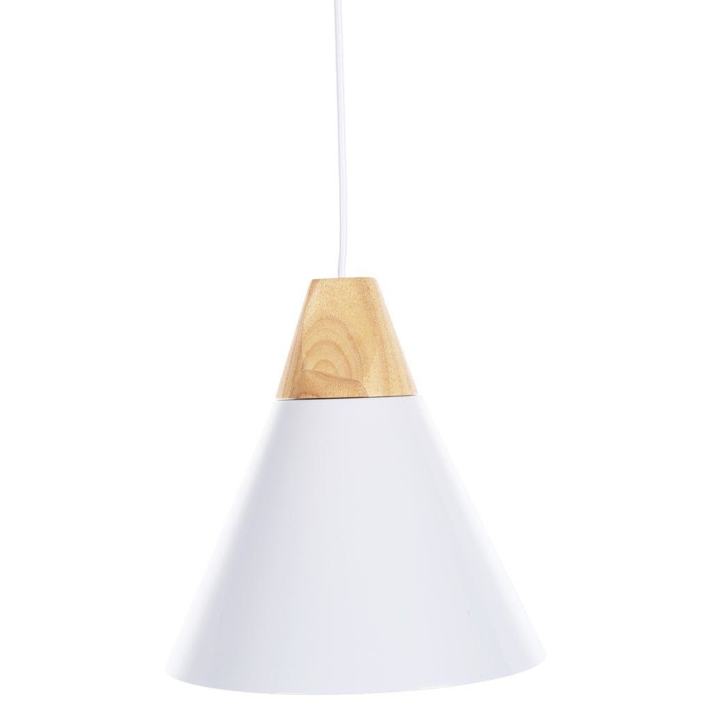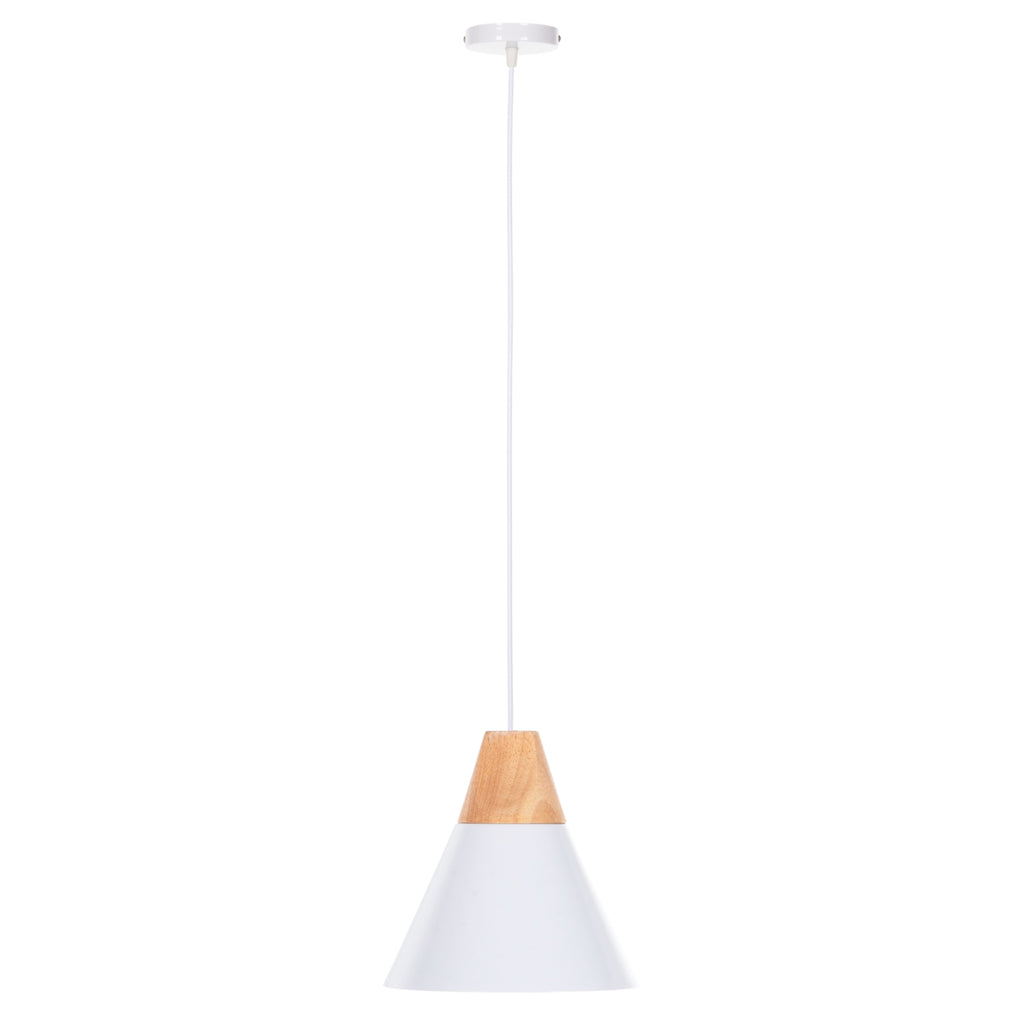 Открийте нашата нова висяща таванна лампа и завършете декорацията си. Това е лампа с БЯЛА метална капачка във формата на конична камбана с дървени детайли в горната част на лампата. Естетически, той е завършен с също така БЯЛ окачен кабел и бяла таванна основа и е най-новата тенденция в таванните светлини.
