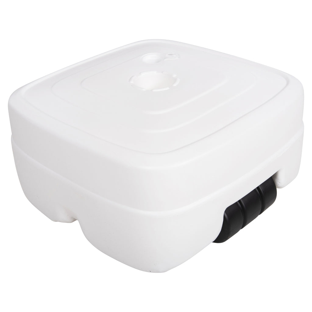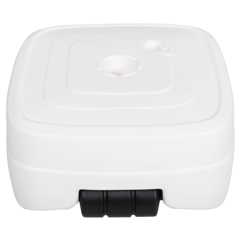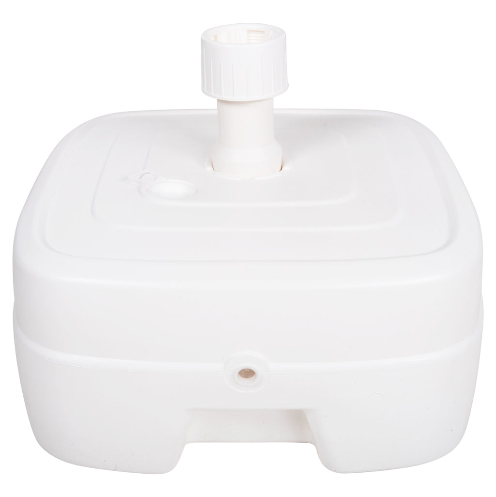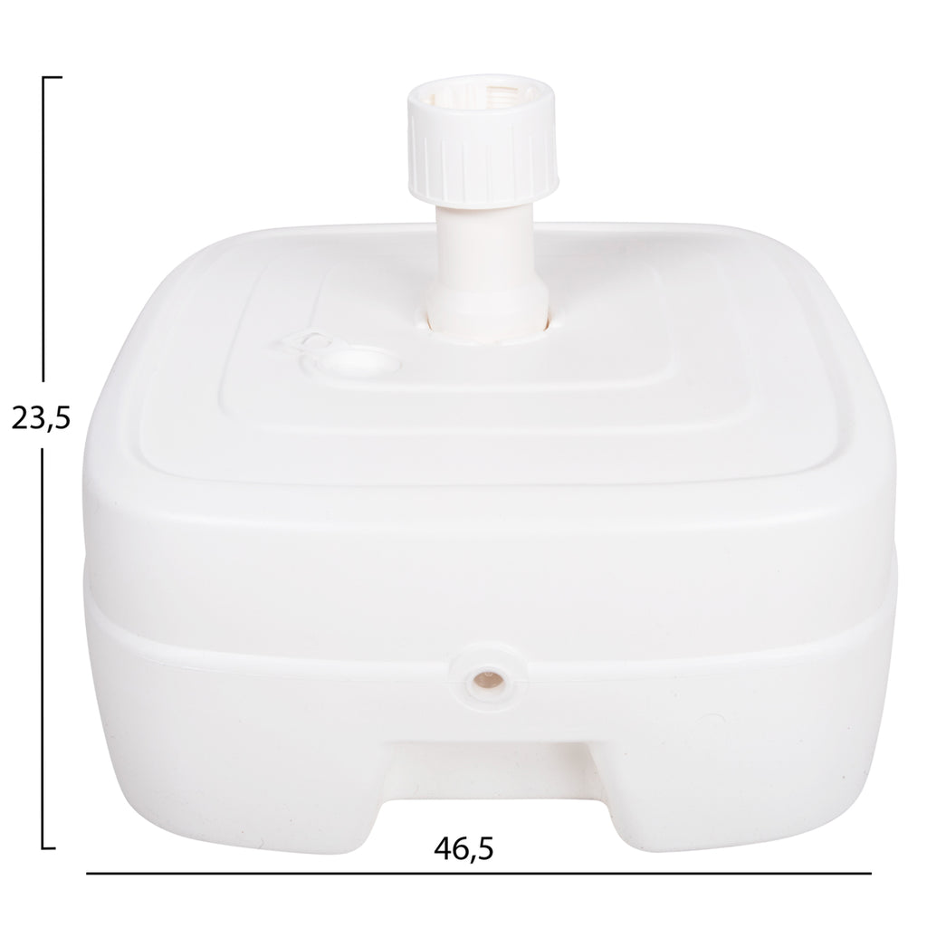 SOLBAS е новото попълнение в нашата гама в категорията основи за плажни чадъри. Това е квадратна пластмасова основа в БЯЛ цвят, която има всички необходими характеристики, които я правят здрава и практична! Има транспортно колело и разбира се регулируема гнездо за прът за чадър. Стълбът трябва да е с размери 33/50 мм. ПЪЛНЕЖ: Вода 40 Lt или водно-пясъчна смес, която увеличава теглото до 76 kg. РАЗМЕРИ: 46.5x46.5x23.5H см. ОСНОВНО ТЕГЛО (лиценз): 1,90 кг * Подходящ за домашна и професионална употреба