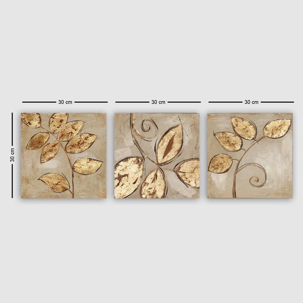 Декоративните картини дават друга перспектива на нашето пространство и подчертават стените, на които са поставени. Класически или модерни, в дърво или върху платно, те променят дома и настроението ни. Декоративна картина върху щамповано платно в дизайн на златни листа. Размери на триптих: 90х30 см. Дебелина: 3см. Европейско производство и произход. Продуктът се предлага във фабрична опаковка.