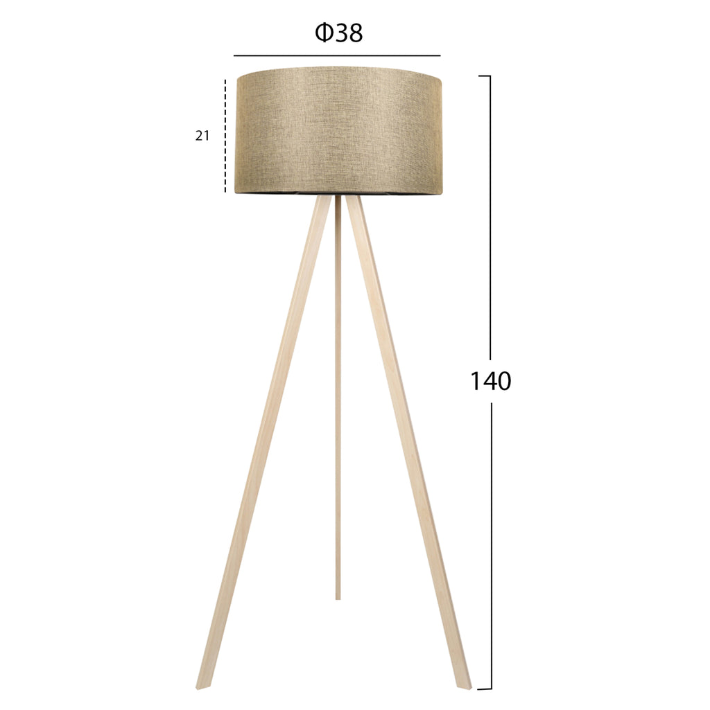 Подова лампа със статив от 100% MDF в натурален цвят. Цилиндричната "шапка" на лампата е в златисто-кафяв нюанс. Красива подова лампа, която ще създаде атмосферата, която винаги сте си представяли за вашето пространство, така че да можете да създадете свой собствен кът за почивка или дори декорация. Защото светлината означава повече от лампа. Това означава декорация, атмосфера, изкуство, усет и разбира се наука. ТЕХНИЧЕСКИ ХАРАКТЕРИСТИКИ: Тип цокъл на крушка (резба) : E27 Нормална цокъл крушка Тип на крушката: Максимално 20w LED, или максимум 60w при нормална Височина на цокъла: 21см. Ширина на шапката: 38см. Обща височина: 140 см. Дължина на кабела: 200 см. с превключвател за включване и изключване Комплект контакти за закачалка: CE сертификат и 100% тест за безопасност. МАТЕРИАЛ НА ИЗРАБОТКА: Стативът е изработен от 100% MDF. MDF (влакна със средна плътност) е модерен потребителски материал, който много често се избира за широк спектър от приложения. Основните му характеристики са, че абсорбира минимална влага, има хомогенност в масата си, задоволителни механични свойства, отлична гладкост и много възможности за обработка. В долната част на трите крака има пластмасови тапи за защита на пода. "Шапката" е изработена от плат и PVC. ПОДДРЪЖКА: Лампата не се нуждае от специална поддръжка, благодарение на лесните за използване материали. Достатъчно е едно бърсане с кърпа както на краката, така и на "шапката", за да изглежда лампата отново като нова. Просто избягвайте всякакви химически почистващи препарати, тъй като могат да избледнеят цвета, както на краката, така и на „шапката“. ПРЕДИМСТВА: Лампата може да се използва в офиси, кафенета, ресторанти, хотели и дори у дома! Тя е "много талантлива" и красива. Благодарение на интелигентния си дизайн, той лесно се комбинира с околното пространство, независимо дали е класическа декорация или по-модерна. Само си представете кът за четене с масичка за кафе и подова лампа! Страхотна снимка!