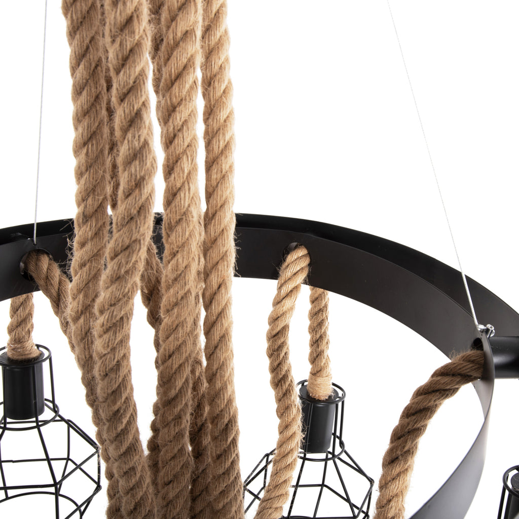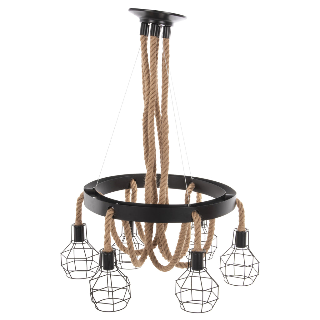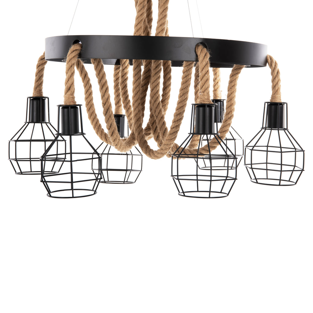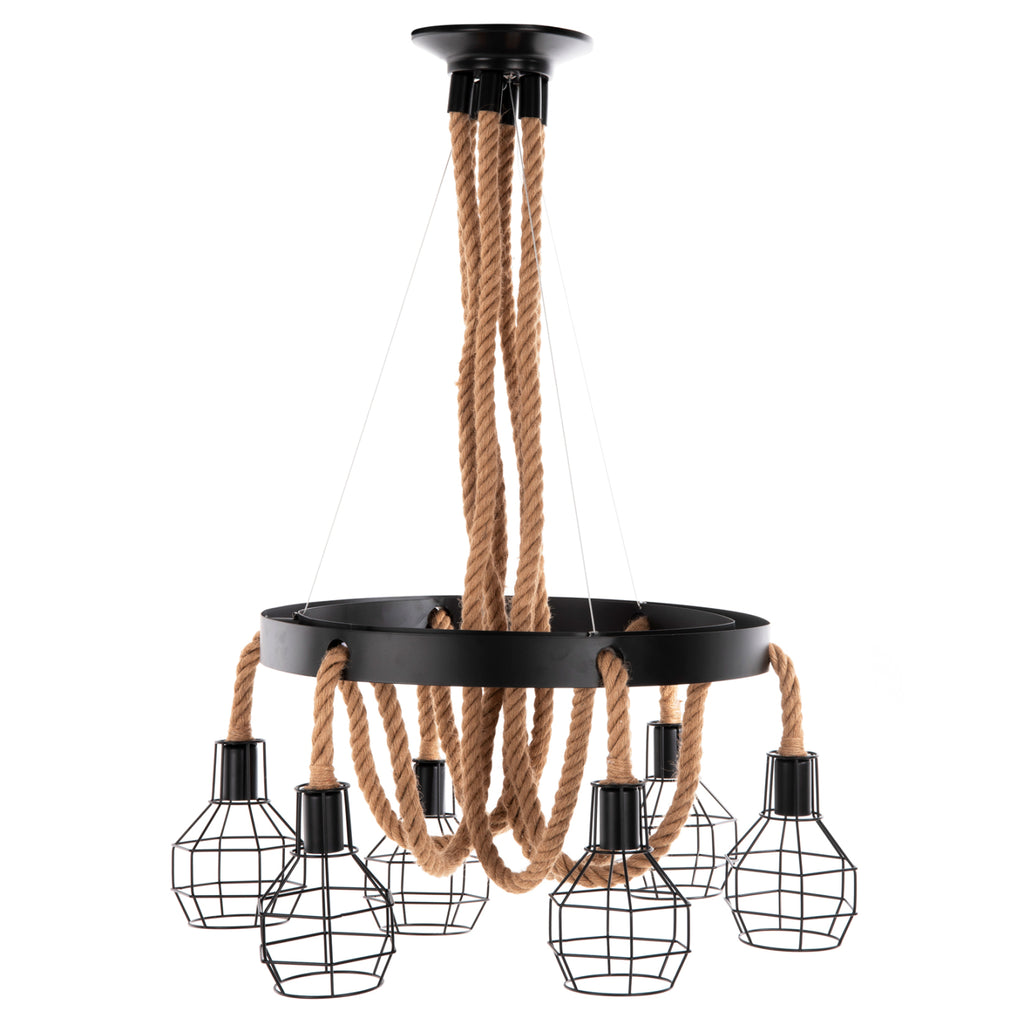 Открийте нашата нова висяща таванна лампа с 6 лампи и не се колебайте да я включите във вашия декор. Комбинацията от въже и метал е специална, а 6-те лампи в метални клетки ще "хвърлят" светлина във всеки ъгъл на стаята. Идеален както за дома, така и за бизнес помещения. ТЕХНИЧЕСКИ ХАРАКТЕРИСТИКИ: Цокъл на крушката: Е27 Цокъл с обикновена крушка Тип на крушката: Препоръчително е да се използва LED 20w Размери на основата: Φ20см. Размери: Φ54-60x125H см. Размери на шапката: 13x15x19H см. CE сертифицирана ПОДДРЪЖКА: Най-важното нещо за тази конкретна лампа е нейното редовно почистване от прах. Ако имате време, разбира се, използвайте влажна кърпа и я направете да изглежда като нова. *Крушките не са включени в цената ** Цветопредаването на продукта може леко да се различава от фотографското изображение на вашия екран.