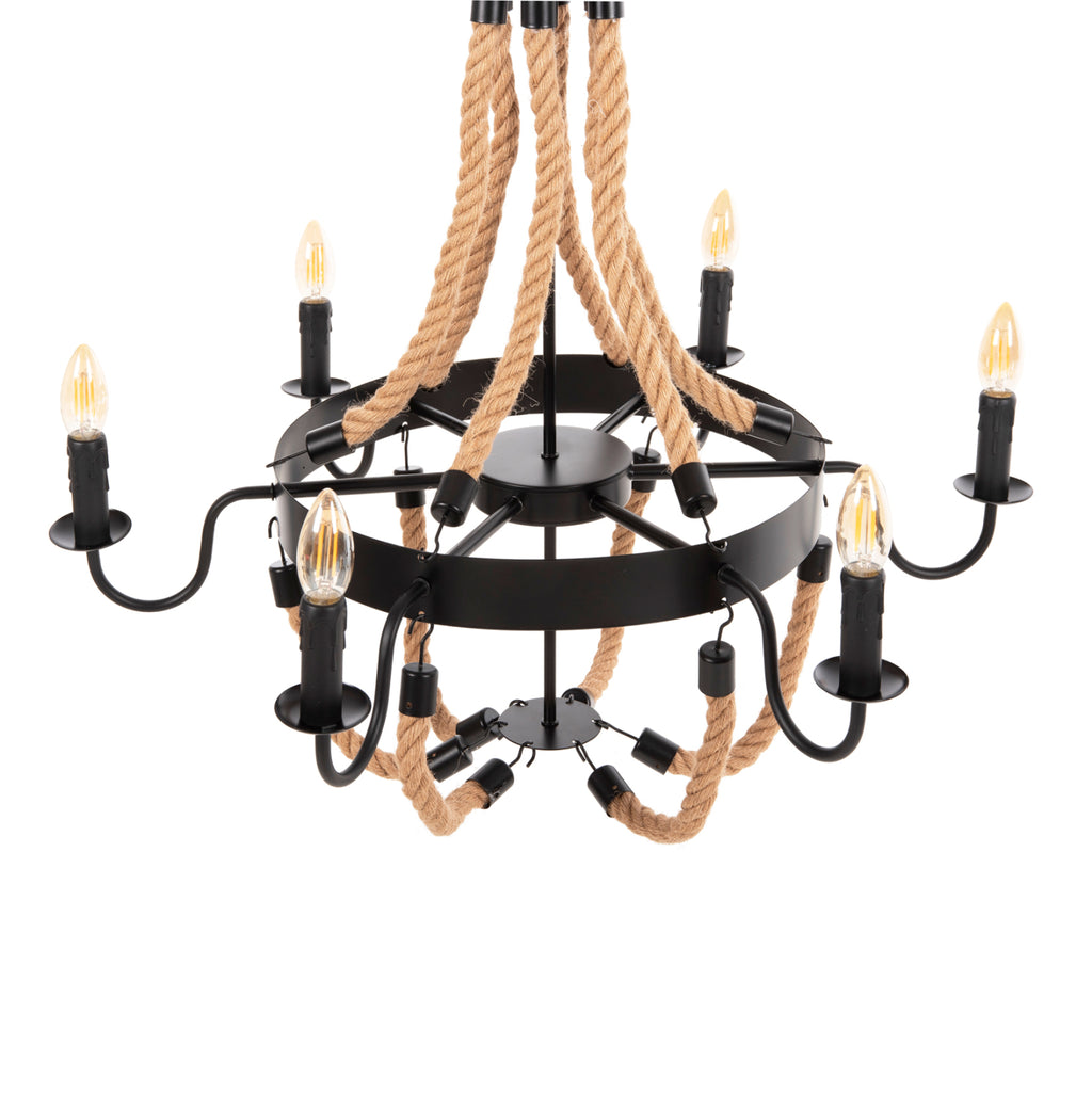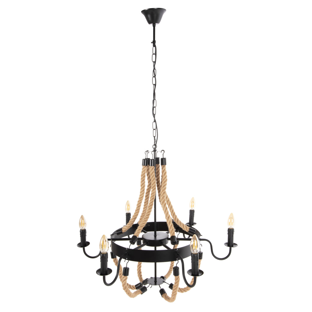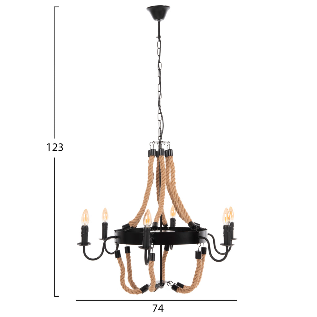Многосветлият MH4177 е друго впечатляващо допълнение към нашата гама. Неговата черна метална рамка е кръгла и виси на верига от тавана. 6-те светлини под формата на свещници са монтирани върху кръглата рамка, а изображението се допълва от въжетата, които придават на лампата усещането за полилей. Тази многофункционална лампа ще освети големи пространства с много светлина и ще впечатли с красивия си дизайн. ТЕХНИЧЕСКИ ХАРАКТЕРИСТИКИ: Цокъл на крушката: E27 Цокъл с обикновена крушка Тип на крушката: Препоръчително е да се използва LED 20w Размери: 74x74x123H cm. CE сертифицирана ПОДДРЪЖКА: Най-важното нещо за тази конкретна лампа е нейното редовно почистване от прах. Ако имате време, разбира се, използвайте влажна кърпа и я направете да изглежда като нова. * Продуктът се доставя във фабрична опаковка, без крушки **Точното цветопредаване на продукта може леко да се различава от действителния продукт поради различните настройки на всеки монитор. ***Продуктът не е разглобен и се нуждае от сглобяване.