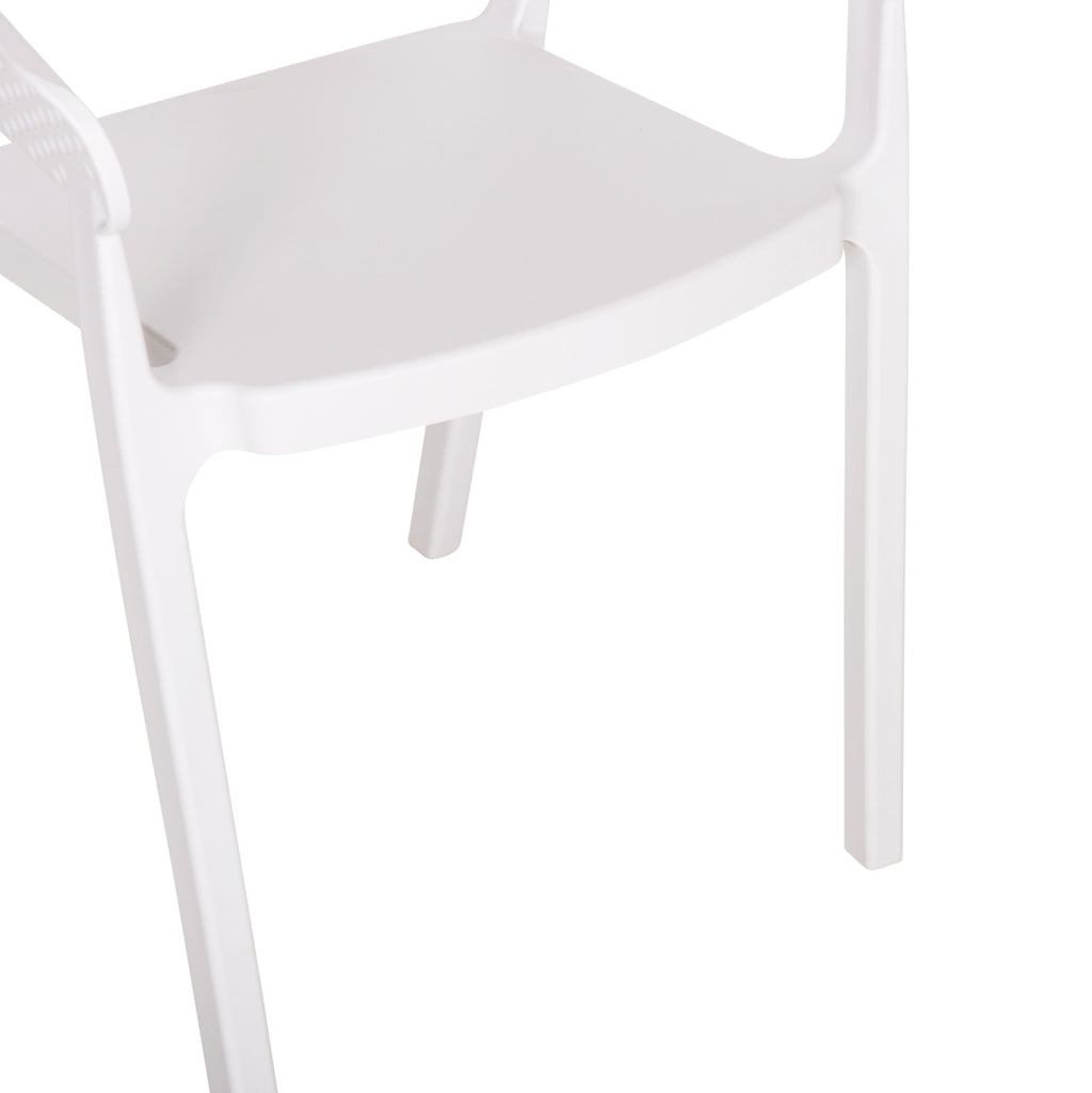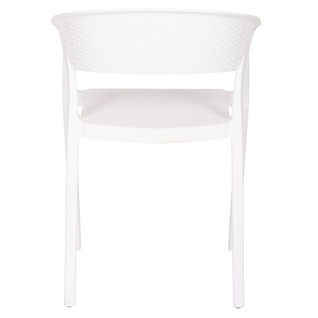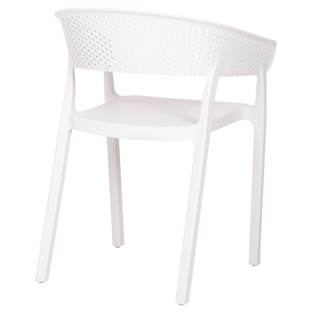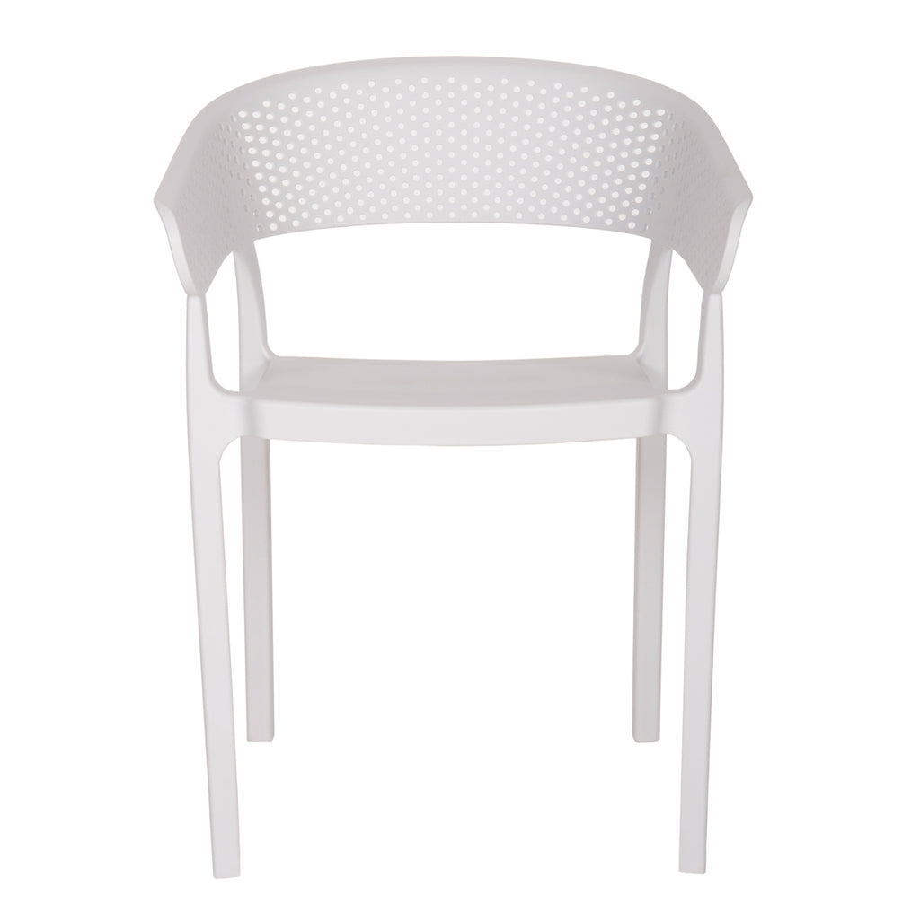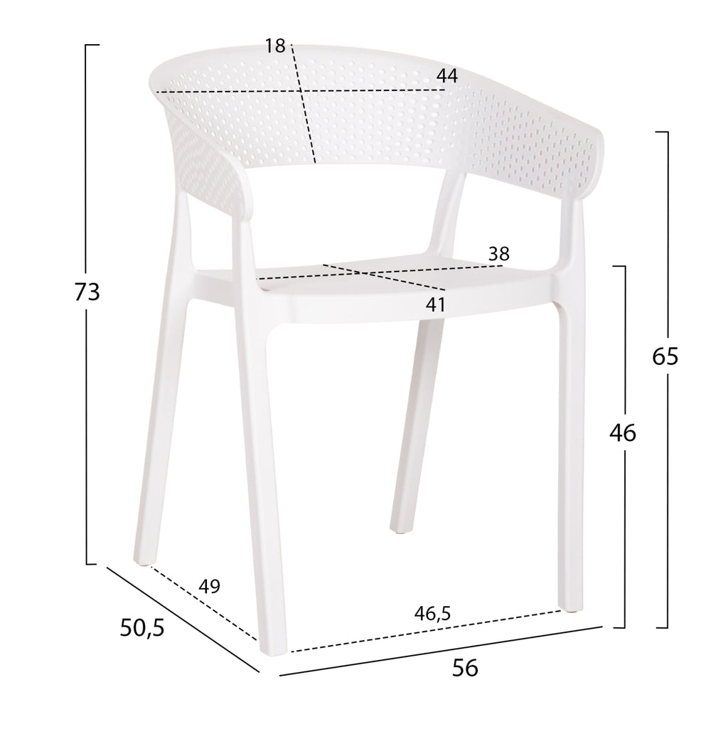 Полипропиленово кресло бяло. Идеално предложение за използване във външни пространства, независимо дали професионални (банкетни зали, кетъринг компании и др.) или за дома. Фотьойлът се състои от гладка седалка и полукръгла, независима и "перфорирана" облегалка и подлакътници. Той е красив и ще обнови естетически всяко външно пространство. РАЗМЕРИ: 56x50.5x73H см. Височина на седалката: 46 см. Височина на ръцете: 65см. Размери на седалката: 38х41см. Размер на гърба: 44х18см. Разстояние между краката: 46,5х49 см. МАТЕРИАЛ НА ИЗРАБОТКА: Столът е изработен от 100% висококачествен полипропилен. Полипропиленът е особено устойчив на тегло и вода, като същевременно има голяма устойчивост на температури до 125 градуса по Целзий. Освен това неговата издръжливост не се ограничава до тегло, вода и температура, но е необичайно устойчив на много химически разтворители, киселини и основи. ПОДДРЪЖКА: Полипропиленовите столове се почистват лесно с влажна кърпа. Ако са на открито, могат да се почистват директно с течаща вода. ПРЕДИМСТВА: Полипропиленовият стол има само предимства и е чудесен избор за външни бизнес пространства. По-специално, неговият сравнително удобен размер, както и неговата издръжливост, го правят най-добрият избор за банкетни зали или за кетъринг фирми, или за всяко открито пространство, благодарение на изключителната му лекота за подреждане на големи количества. Но най-важното нещо за полипропилена е, че той е екологичен, защото може да се рециклира.