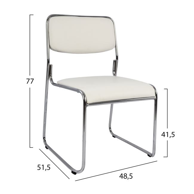 Накарайте гостите или колегите си да се чувстват комфортно със стола QUARRY. Това е съвместен офис стол в бял цвят и семпъл дизайн, но със сигурност красив. Той е хромиран, а седалката и облегалката са независими една от друга. Облегалката и седалката са широки, за да е по-приятно и удобно за използване. Рамката на стола следва дизайн с квадратни крака без ръце и позволява пълна свобода на движение. РАЗМЕРИ: Размери: 48.5х51.5х77см. Височина на седалката: 41,5 см. МАТЕРИАЛИ НА ИЗРАБОТКА: Рамката на стола е изцяло метална с лъскаво хромирано покритие. Седалката и облегалката са покрити с висококачествена PU кожа. Това е известно още като синтетична кожа или изкуствена кожа и има текстурата на ленен плат. Синтетичната кожа е еволюцията на изкуствената кожа, но с основната характеристика, че не се различава лесно от окото от истинската кожа. Съставът му е основно полиуретан и полиамидни микровлакна, за разлика от изкуствената кожа, която основно съдържа PVC. В долната част на извитата подредба на стола има пластмасови тапи за защита на пода. ПОДДРЪЖКА: Столът не се нуждае от специална поддръжка. Металната рамка е издръжлива, а хромираното покритие осигурява допълнителна защита. Следователно едно минаване с влажна кърпа е достатъчно. PU кожата се почиства с влажна кърпа и само при упорити петна можете да използвате мек почистващ препарат. Като цяло PU не се напуква и не се влияе от слънцето. ПРЕДИМСТВА: Столът QUARRY е прост и полезен съвместен стол, който ще ви удовлетвори максимално. Той е красив с широка седалка и е идеалният избор за заседателни зали или приемни, защото е лесен за транспортиране благодарение на лекото си тегло и общата лекота на транспортиране (също така може да се подрежда един върху друг), благодарение на дизайна си без ръце. Неговият общ дизайн лесно се комбинира с много декоративни шарки и с много различни пространства, без да се правят компромиси. Предимства: Готов за сглобяване и подреждане. Отлично съотношение цена/качество.