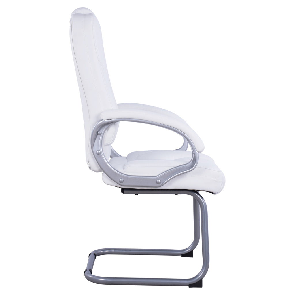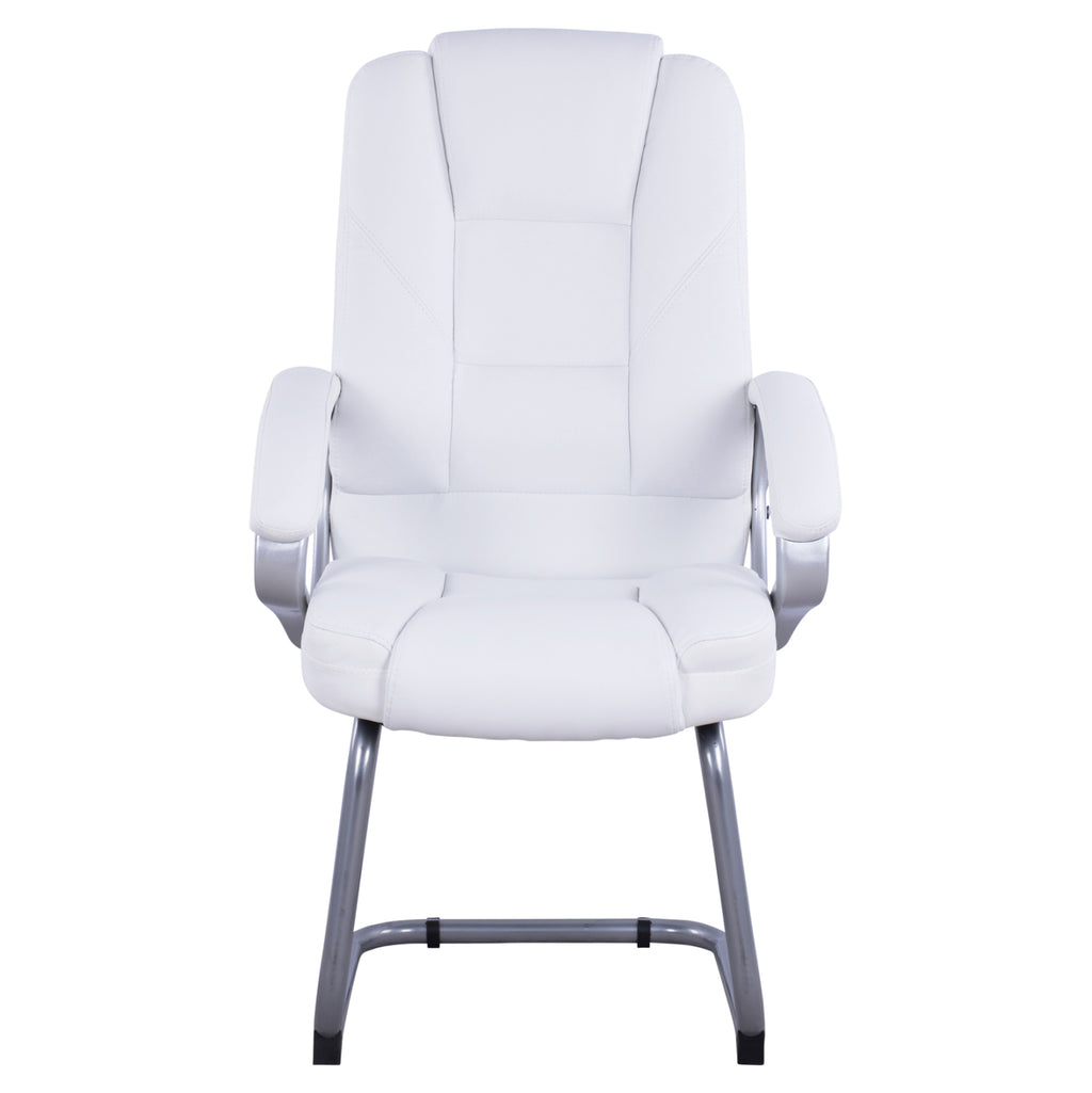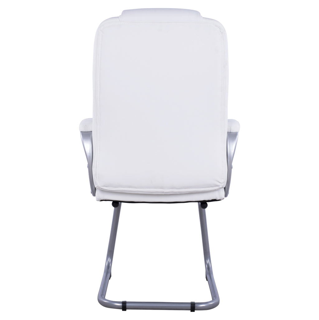 Стол за гости с подлакътници, удобен и издръжлив, тапициран с висококачествена и издръжлива изкуствена кожа в бял цвят, с хромирана метална основа. Размери: 63х67х112см. Височина на седалката: 49 см. Височина на ръцете: 73см. Размери на седалката: 49х51 см.