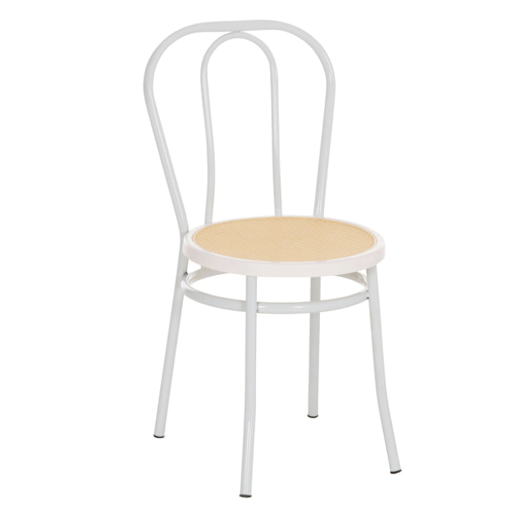 Трапезарен стол тип Виена с метална конструкция и седалка от пластмасова ратанова изплетка.