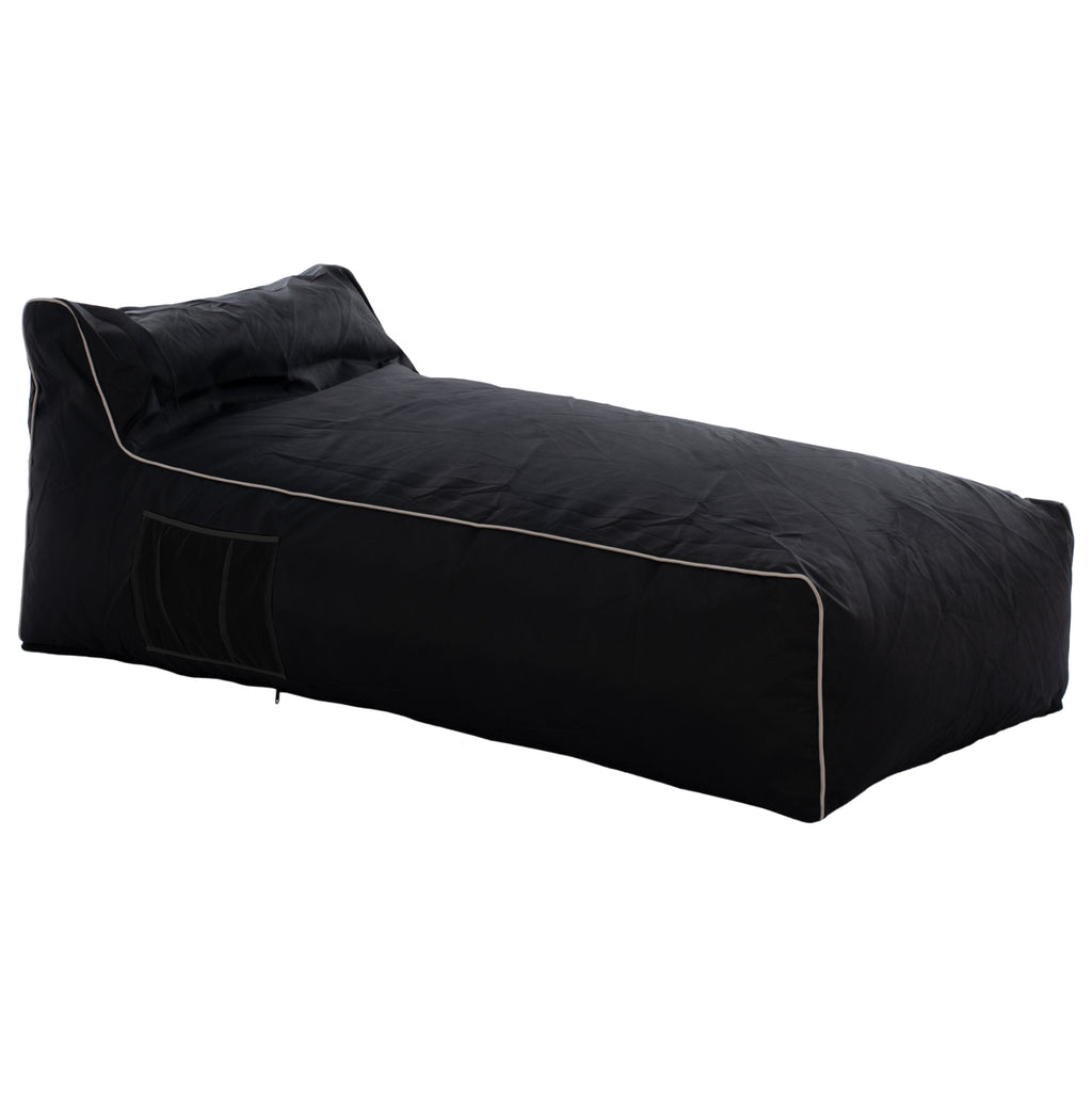 Комфорт и лукс за пуф, произведен по най-високите стандарти за качество. Професионален шезлонг пуф, изработен от textline 2x1 в черен нюанс, много устойчив на слънце, влага и триене. Декоративният бял реле придава отличителен стил, следвайки елегантния дизайн на пуфа. Има подсилен цип за лесен достъп до вътрешността му и за по-лесна смяна на пълнежа в бъдеще, ако е необходимо. Вътрешният му пълнеж е от полистиролови гранули, които гарантират, че пуфът никога няма да потъне. Има и специален джоб отстрани за поставяне на списание или книга. Това е красив и напълно удобен пуф за плажни барове, барове край басейна и всяко външно пространство, което искате да превърнете в гостоприемна и стилна среда. Този пуф е идеален за професионална употреба, благодарение на високото качество на текстила и неговия пълнеж. Размери: 190x80x40-60H см. Височина на седалката: 40см.