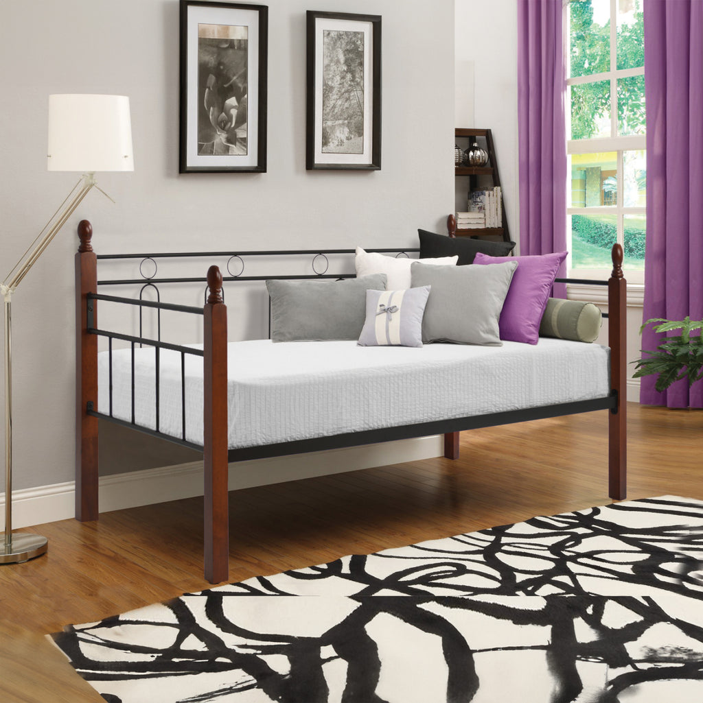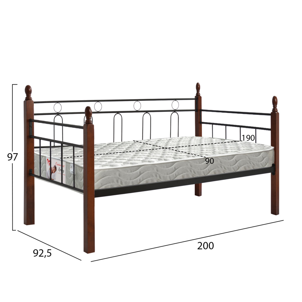 • Разтегателният диван REVEN с размер за единичен матрак е композиция от метал в цвят ЧЕРНО и дърво в нюанс МРЪСЕН ДЪБ. 4-те крака-колони са дървените части на композицията, докато останалата част е метална. • Матракът, който придружава леглото, е с размери 90x190см и е с технология с непрекъснати пружини и е едностранен, което означава, че не е необходимо да го обърнете. РАЗМЕРИ: Външни: 92.5x200x97Y см. Височина на подлакътниците: 73 см. Височина до дъските на матрака: 34 см. Размери на матрак: 90x190 см.----- Височина на матрак: 18 см. ПОДДРЪЖКА: Всичко, от което леглото се нуждаете, е почистване от прах и, ако желаете, забърсване с влажна кърпа. *Продуктът се доставя несглобен във фабрична опаковка. **Цветопредлагането на продукта може лесно да се различава от фотографското муне, показвано на вашия екран.