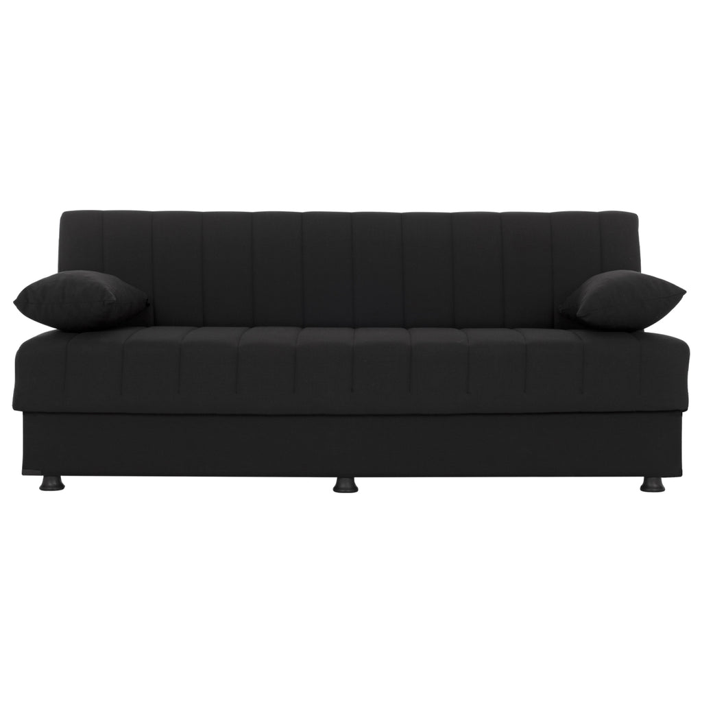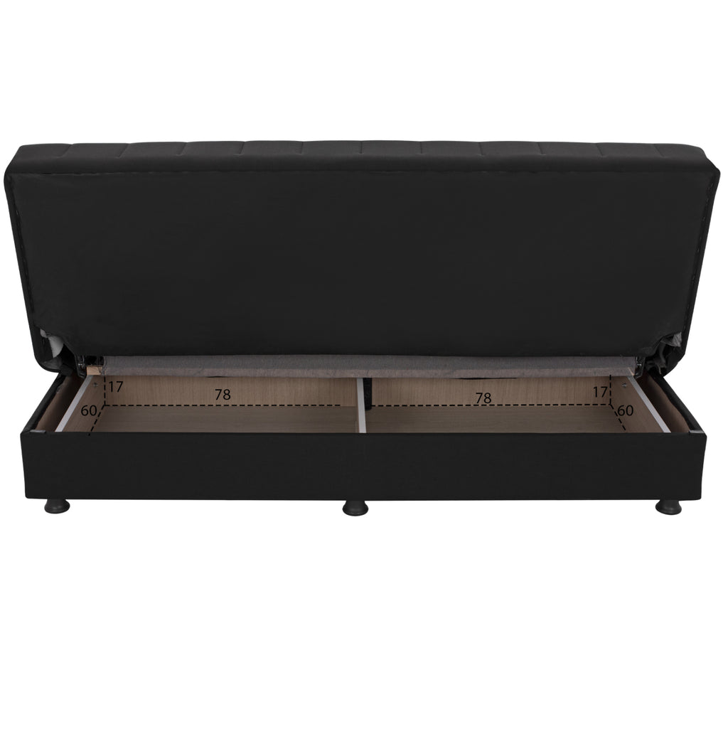 Представяме ви нов, триместен разтегателен диван. Висококачествен и особено практичен диван, който ще зарадва както собственика си, така и гостите му! Започвайки от основите и очевидното, цветът на тапицерията с отличната и добре ушита материя на този диван е ЧЕРЕН. Разполага с 2 малки продълговати възглавници със същата материя, които могат да се използват както всеки желае. Характерно за този диван е, че няма подлакътници, в резултат на което не ограничава използването му от потребителите. Той също така се превръща много лесно в легло чрез удобен механизъм (клик-клак), умножавайки полезността му. Под седалката на дивана има 2 места за съхранение с подсилен под, което го прави истински мултифункционален инструмент, особено за студентски къщи, но и за къщи с ограничено пространство като цяло. РАЗМЕРИ: Общи размери: 180x72x77 см. Размери на седалката: 180x56 см. Височина на седалката: 40 см. Размери на облегалката: 180x40 см. Размери на леглото: 180x100 см. Място за съхранение: 78x60x17 см. (x2) Размери на възглавницата: 48x28x17 см. МАТЕРИАЛИ ЗА КОНСТРУКЦИЯ: Рамката на дивана е изработена от дърво. Краката на дивана са ниски, кръгли и изработени от подсилен полиетилен с отлична устойчивост на тегло и влага. Платът, който покрива целия диван, е с отлично качество и е добре пришит към средно твърдата пяна на седалката и облегалката, която е със същата плътност и дебелина, тъй като диванът се превръща и в легло. ПОДДРЪЖКА: Качествените материали за изработка на дивана го правят изключително лесен за употреба! Едно забърсване с влажна кърпа върху цялата му повърхност ще го освежи и ще го запази като нов в продължение на много години. ПРЕДИМСТВА: Този диван е истински мултифункционален инструмент. Той предлага всички характеристики, които го отличават в своята категория. Има двойно приложение като диван и легло, има места за съхранение и няма подлакътници, което увеличава комфорта, който предлага като легло. Но друго много важно предимство са удобните му размери, които го правят подходящ за малки къщи и стаи, а също така го правят лесен за транспортиране.