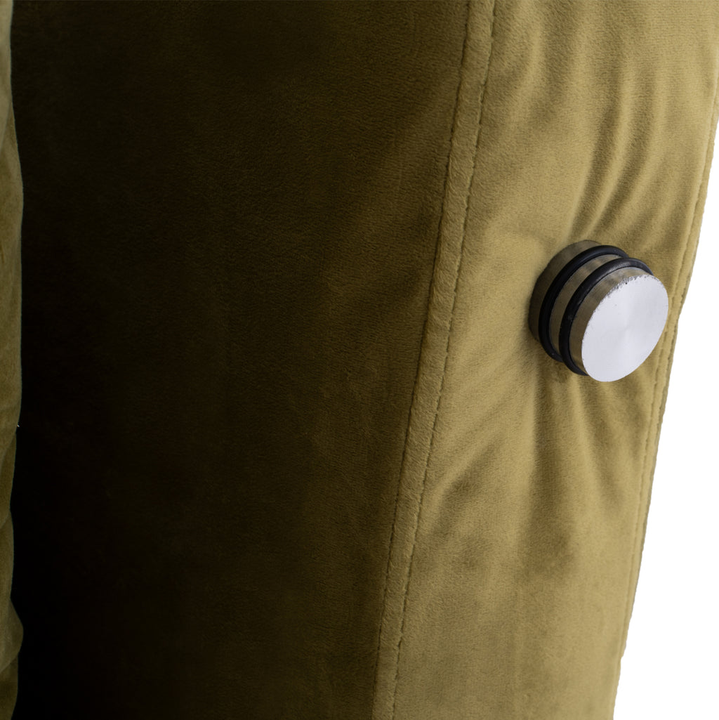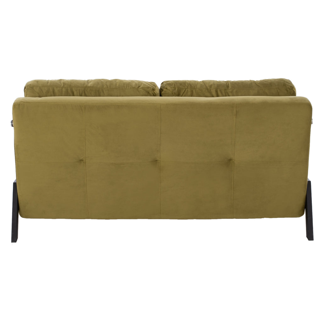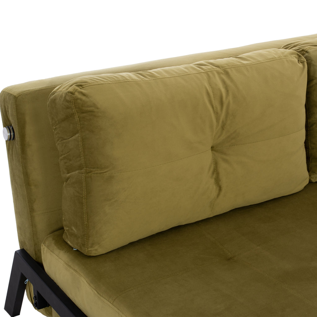 Кадифен разтегателен диван в маслинен нюанс 150x87x79 см. Ако търсите комфорт и функционалност във вашите мебели, този продукт ще ви осигури и двете. Този универсален диван е идеален за неочаквани нощуващи гости, като същевременно осигурява удобна зона за сядане. Има механизъм за сгъване от три части, като с едно движение се превръща в легло. Изработена от кадифена материя в маслинен нюанс, с големи възглавници и метални крака в черен нюанс. Той е идеален избор за тези от вас, които търсят нещо елегантно, функционално и качествено. Височина на седалката: 40см. Размери на седалката: 145x54-75 см. Разстояние между краката: 151x92 см. Височина на крака: 27 см. Легло: 145х198х36см. Възглавници: 70х42 см. Дебелина на възглавницата: 18см.