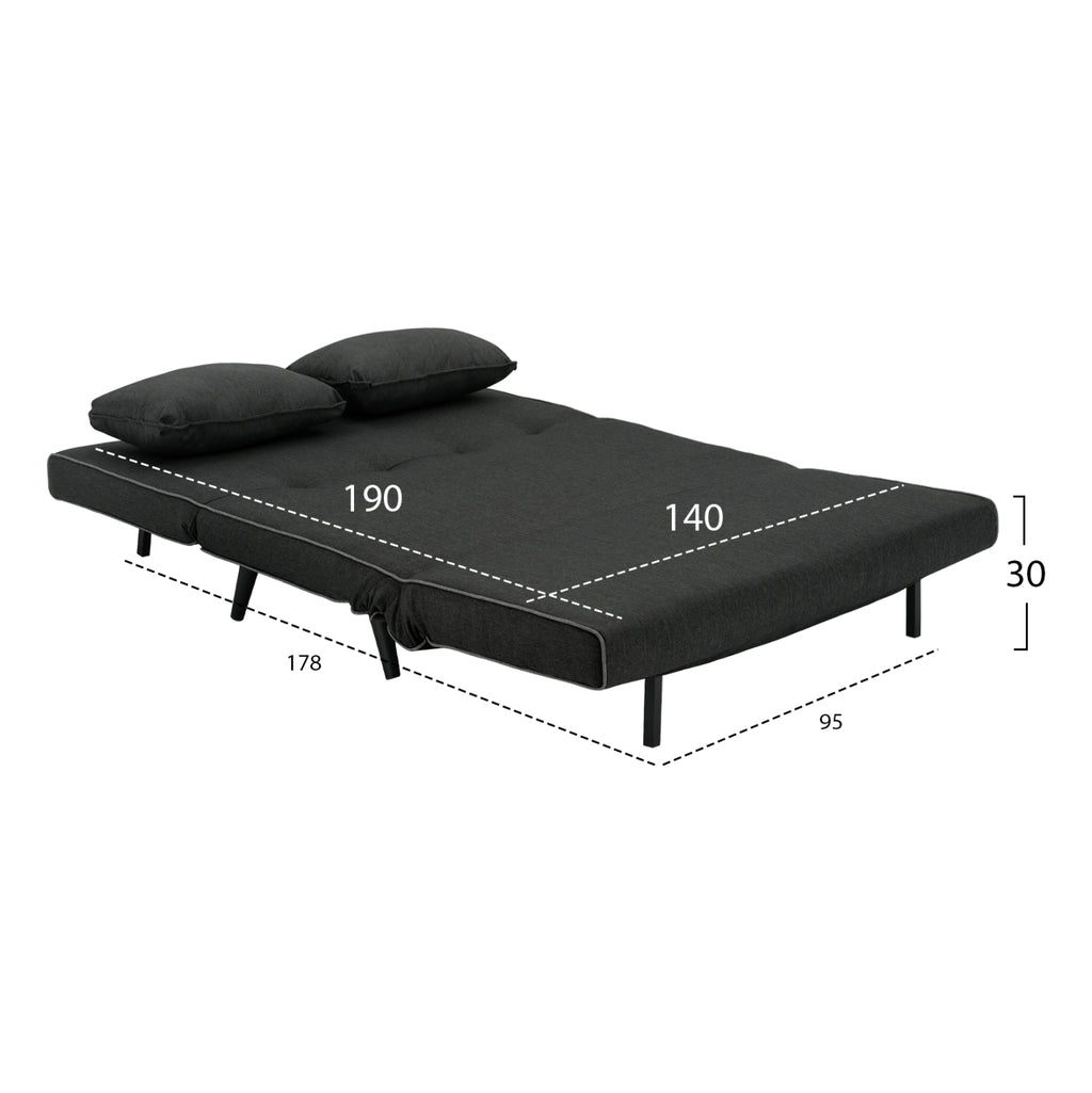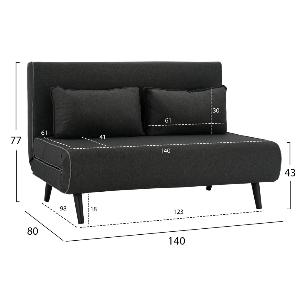 ASMA е разтегателен диван, идеален за настаняване на 2 човека, тапициран с чудесна качествена дамаска в ТЪМНО СИВ нюанс. Ако търсите комфорт и функционалност във вашите мебели, този продукт ще ви осигури и двете. Този универсален диван е идеален за неочаквани нощуващи гости (2-ма души), като същевременно осигурява удобни места за сядане. Има механизъм за сгъване от три части, като с едно движение се превръща в легло. Има големи възглавници и дървени крака в черен нюанс. Той е идеален избор за тези от вас, които търсят нещо елегантно, функционално и качествено. ПОДДРЪЖКА Достатъчно е бърсане и минаване с влажна кърпа. РАЗМЕРИ: 140x80x77Y см Височина на седалката: 43 см Размери на седалката: 140x41-61 см Разстояние на краката: 123x98 см Легло: 190x140x30Y см Разстояние на краката: 178x95 см Възглавници: 61x30 см (2) Дебелина на възглавницата: 20 см. Височина на крака: 18 см.