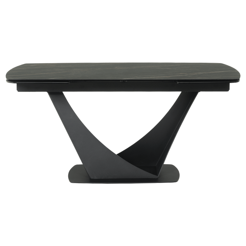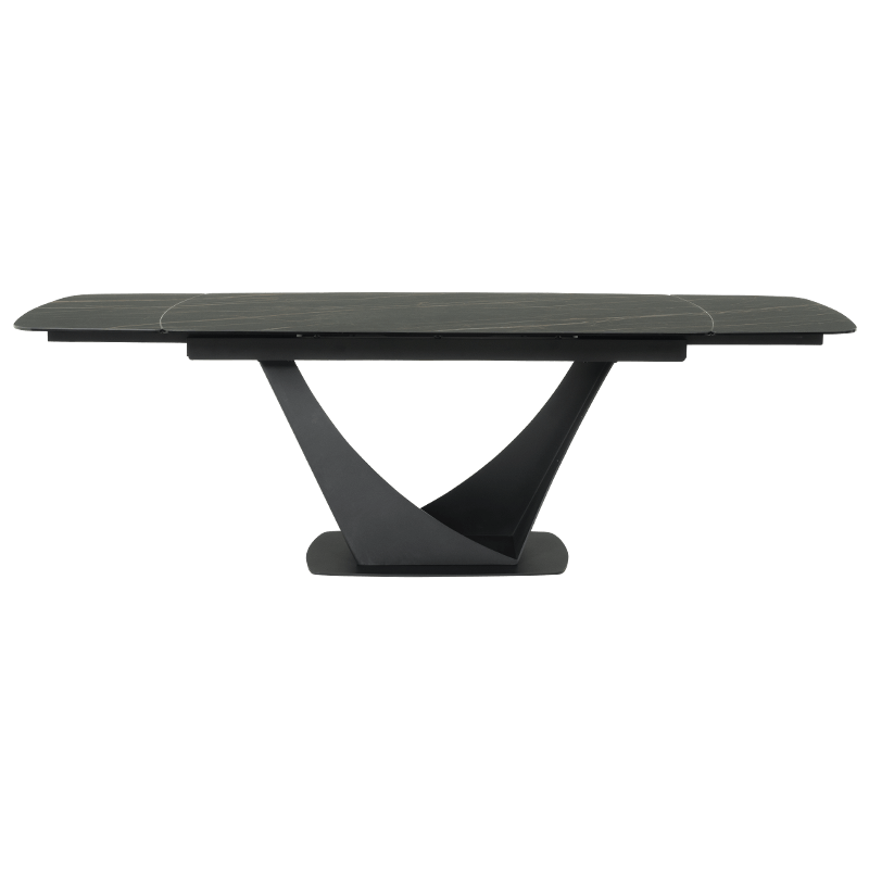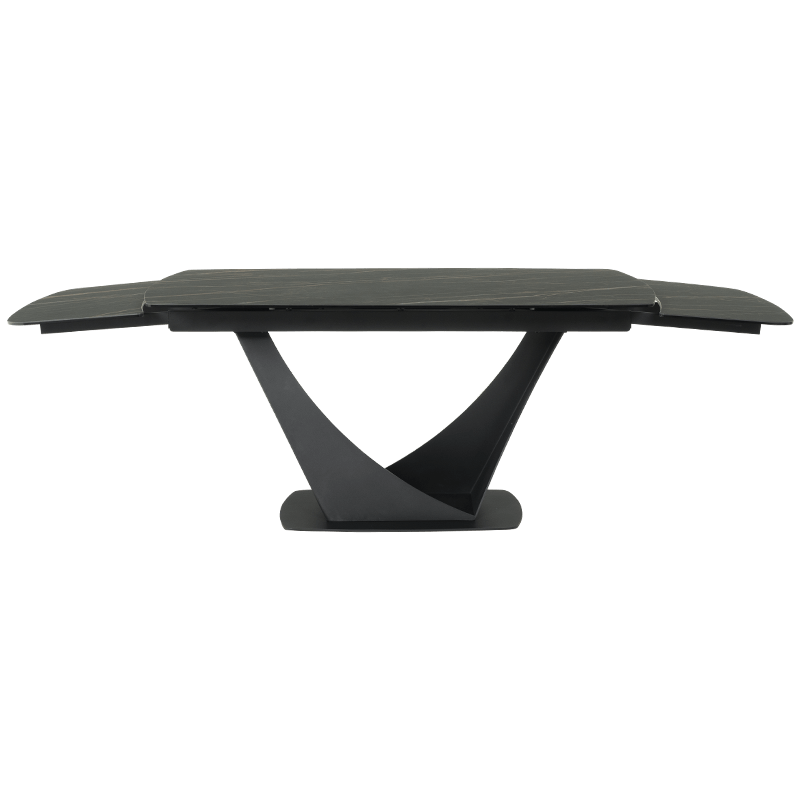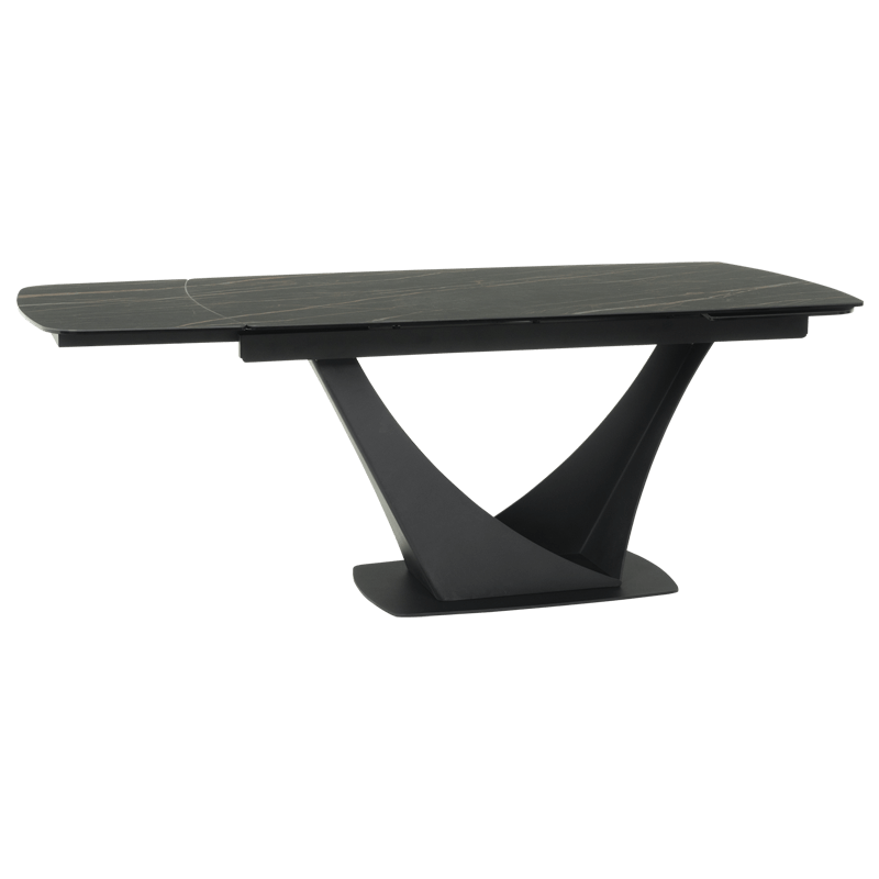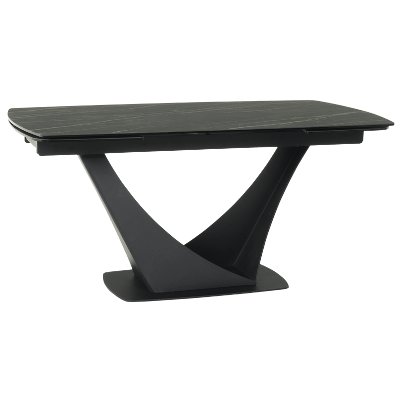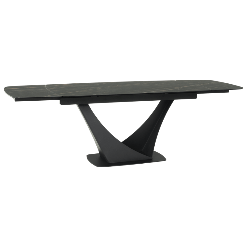 BOREK е голяма трапезна маса с красив и изтънчен дизайн. Моделът е с размери 160 х 90 см и височина 76 см. Масата се разтяга чрез две странични плоскости, като достига до дължина 240 см. Основата е изработена от праховобоядисан метал, а плотът от керамика и закалено стъкло с обща дебелина 12 мм. Пълна информация за размерите и характеристиките на модела ще намерите в таблицата в таб/поле "Техническа информация".