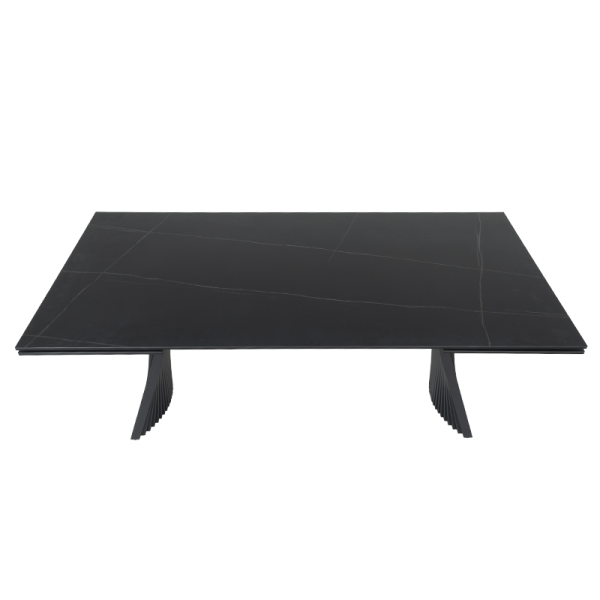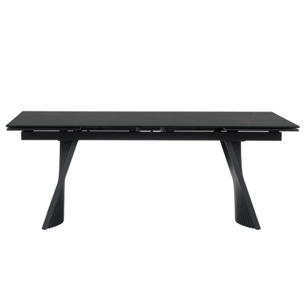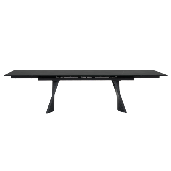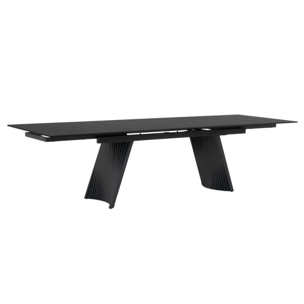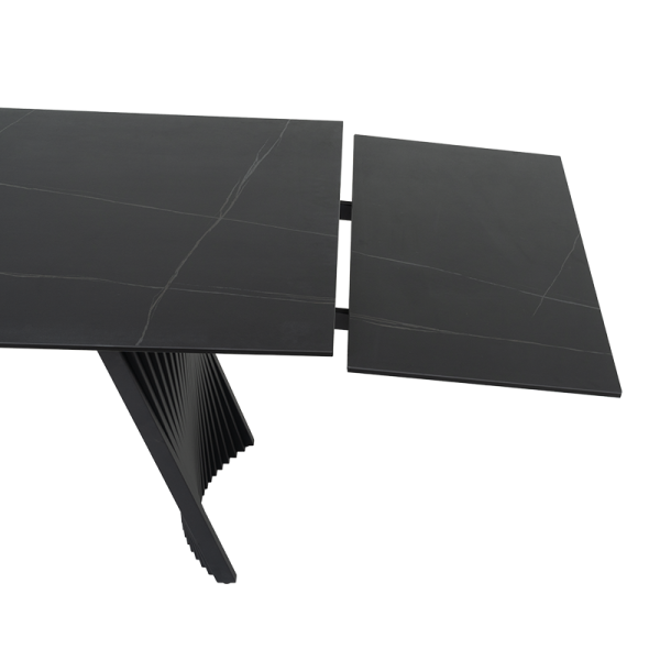 Трапезна маса KOWAL е истински шедьовър на съвременния дизайн, създаден да впечатлява с елегантност и функционалност. Плотът е с дебелина 13 мм и представлява изящно съчетание от закалено стъкло и керамика, което придава устойчивост и изискан мраморен ефект. Изчистените линии и гладката текстура добавят усещане за лукс и стил. Основата е изработена от праховобоядисан метал в дълбок черен цвят, отличаваща се с архитектурен и динамичен дизайн. Със своите ритмични, вълнообразни форми и изразителен силует, тя създава впечатление за движение и лекота, като същевременно гарантира изключителна стабилност. Интелигентният релсов механизъм позволява плавно разтягане на допълнителните плотове в двата края, превръщайки KOWAL от компактна маса с дължина 200 см в просторна маса от 300 см — идеална за семейни събирания и срещи с приятели. KOWAL съчетава в себе си естетика и практичност, правейки я централно бижу във всяка модерна трапезария. Пълна информация за размерите и характеристиките на модела ще намерите в таблицата в таб/поле "Техническа информация".