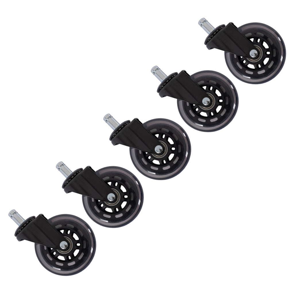 MH1179 е най-новото допълнение към нашата гама от заместители на офис столове. Това е резервен комплект от 5 части с колела, който включва всички функции, които искате от такъв продукт. Това колелце осигурява плавно и тихо търкаляне без досадно скърцане, благодарение на здравата си конструкция и използваните подходящи материали. Мекият еластичен полиуретан, който обгражда колелото, го прави идеален за всякакви повърхности, без да го наранява. Той се търкаля гладко, независимо дали столът ви е върху дървен под, плочки, килим или където и да е. МАТЕРИАЛ: Свързващите валове (щифтове) към основата на стола са изработени от висококачествена стомана, докато останалите метални части на колелцето са изработени от авиационна стомана. Лагерът е от висококачествен тип ABEC 9. Джантата е изработена от твърда найлонова пластмаса, специална за този тип приложения. Колелото е изработено от прозрачен еластичен полиуретан, който обгражда джантата. ТЕХНИЧЕСКИ ХАРАКТЕРИСТИКИ: Размери на карфица: диаметър 1.1см. х височина 2,2 см. Дебелина на колелата: 2,5см. Височина без карфица: 8.83 см. ПОДДРЪЖКА: Продуктът не се нуждае от специална поддръжка, с изключение на почистване на колелцата и премахване на всякакви косми, които може да са се натрупали по валовете на ролките. МОНТАЖ: Колелцата могат да се сменят лесно без инструменти. Издърпайте старите колела от основата на стола и ги махнете. След това монтирайте новите резервни колелца, като натиснете щифта в слота, докато щракне на място. ОБЩИ БЕЛЕЖКИ: Преди да поръчате продукта, моля, уверете се, че сте измерили правилно вашия стол и това са правилните колела. Тези колелца не са съвместими с продуктите на IKEA.