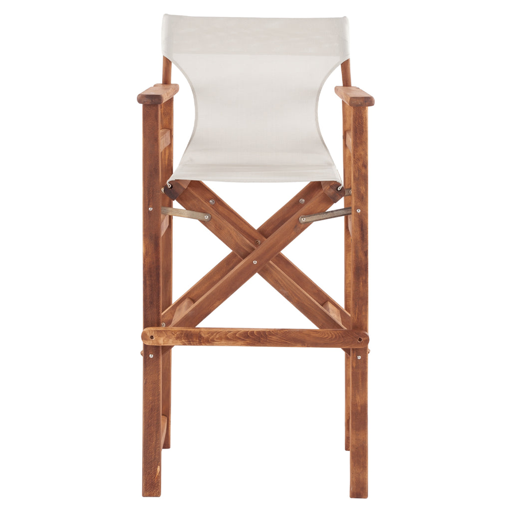Директорски бар стол LIMNOS, сгъваем, впит. Изработен от подсилена рамка от 100% масивна букова дървесина в цвят орех с перфорирано PVC в мръсно бял цвят. Цвят на рамката: Орех Цвят PVC: Екрю Размери: 58х58х118 см. Височина на ръцете: 98см. Височина на седалката: 76 см. Размери на седалката: 43х40 см. Подходящ за бизнес помещение. Забележка: Продуктът е изработен от естествена масивна букова дървесина. Съществуващите пукнатини или тези, които могат да се образуват с времето, са част от естествената форма на материала и придават оригиналност и уникален дизайн на вашето пространство. По време на производствения процес съществуващите пукнатини се изглаждат и стабилизират с материал от същата дървесина. Поради това може да има цветови вариации и разлики в размерите на продукта поради размерите на обработената дървесина. Това не са дефект на продукта.