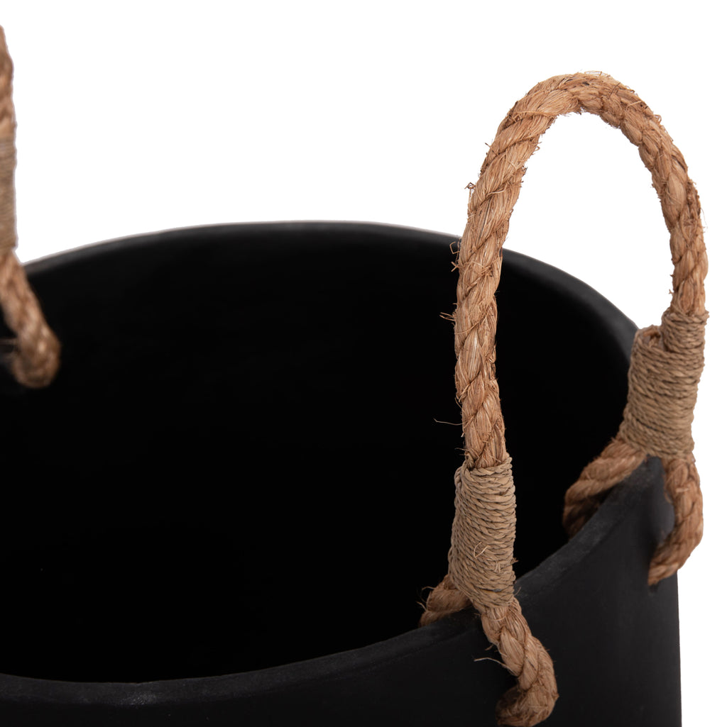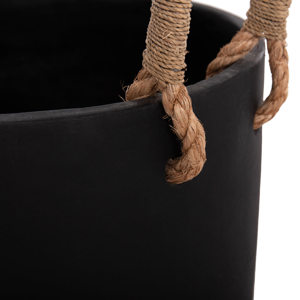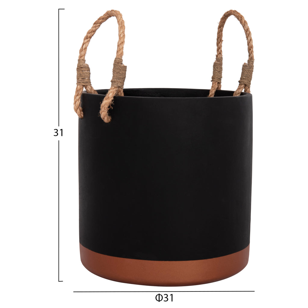 Саксията от серия TRYLL е изработена от фиброцимент в ЧЕРЕН цвят с БРОНЗОВА основа. Особеността им е, че имат дръжки, изработени от издръжливо въже за лесно транспортиране. *САМО ЗА УПОТРЕБА НА ЗАКРИТО* РАЗМЕРИ: Φ31x31H cm. СТРОИТЕЛНИ МАТЕРИАЛИ: Фиброциментът е композитен строителен материал, изработен от цимент, армиран с целулозни влакна. Известен е със своята издръжливост, устойчивост на гниене, вода и насекоми, което го прави избор с ниска поддръжка. Предимства: • Изисква минимална поддръжка и се почиства лесно. • Не е запалим. • Устойчивост на гниене и вредители. ПОДДРЪЖКА: Едно почистване с прах обикновено е достатъчно, но избягвайте използването на химически почистващи препарати. **Точното цветопредаване на продукта може леко да се различава от действителния продукт поради различни настройки на монитора.