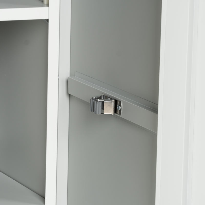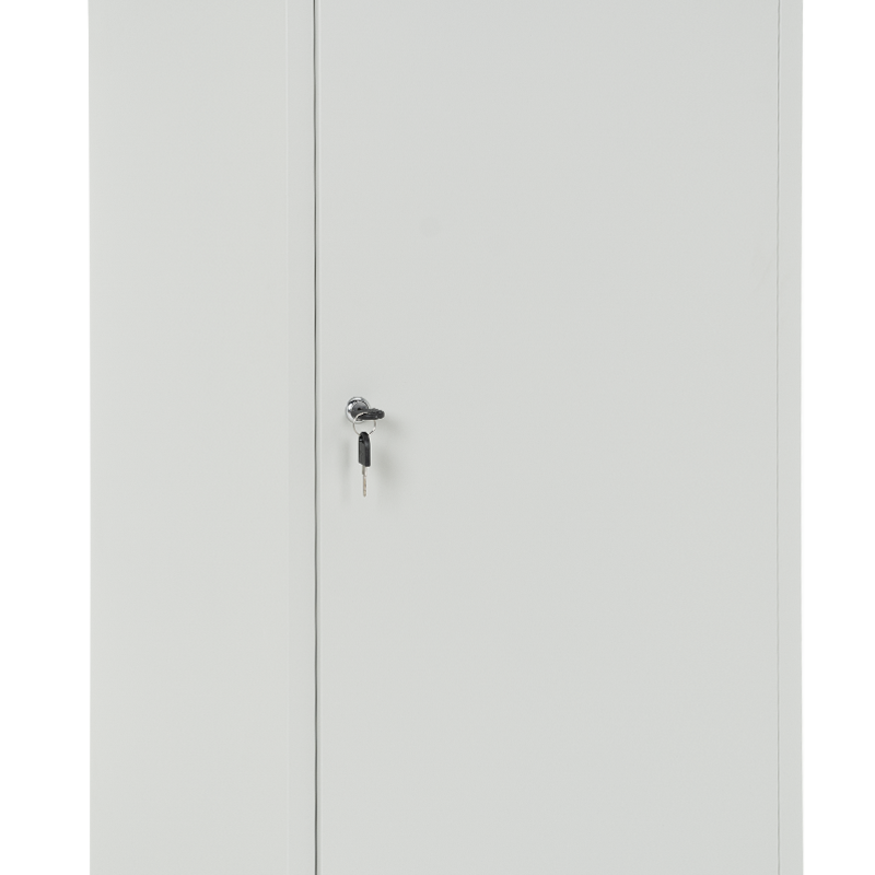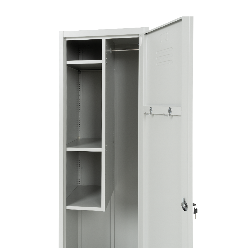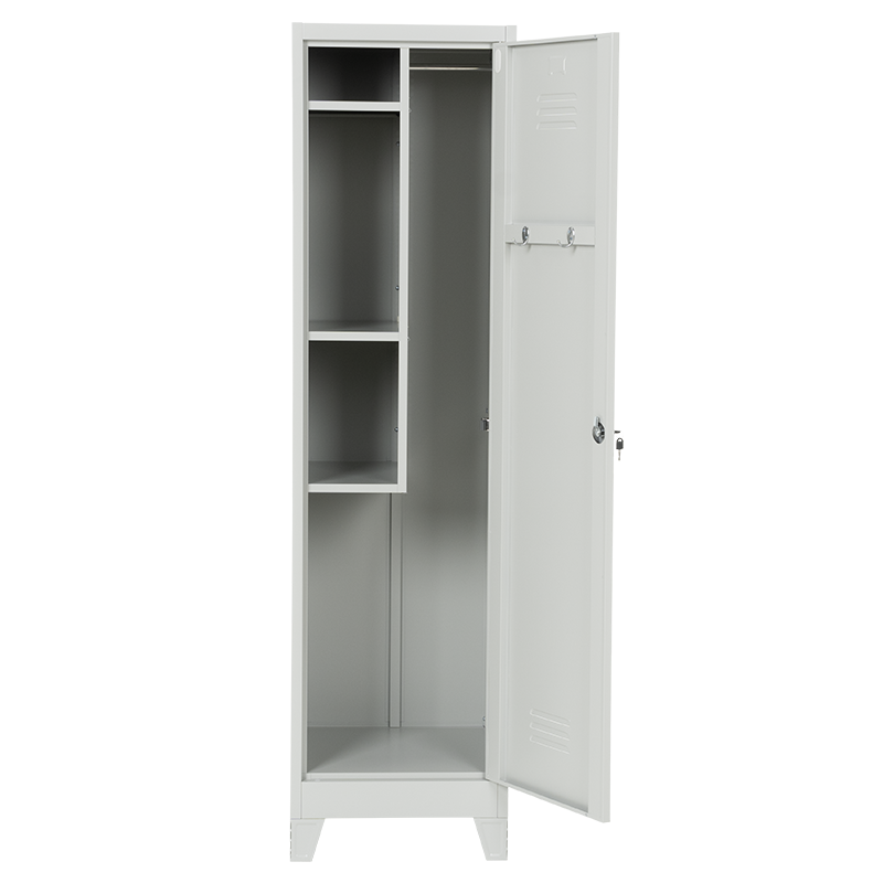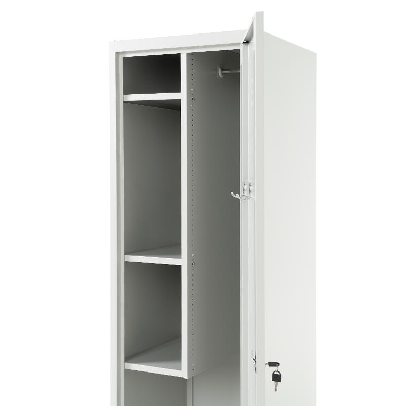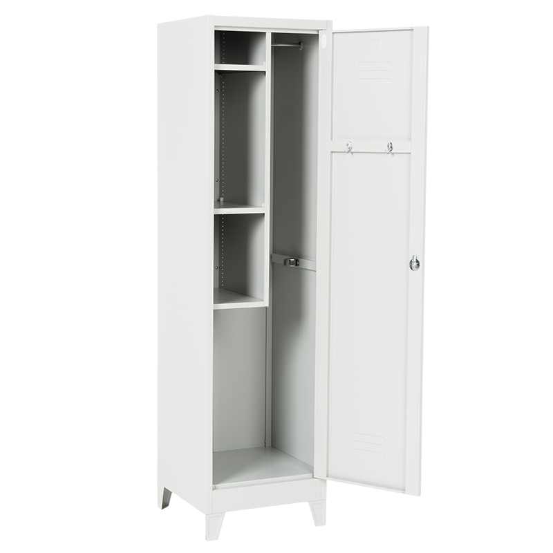 Металният санитарен шкаф Carmen CR-1284 E J е универсално решение за съхранение, подходящо за офиси, съблекални и санитарни помещения. Изработен от праховобоядисан метал със светлосиво покритие, той предлага три здрави рафта с товароносимост до 40 кг, лост за закачалки и два кукички за допълнително удобство. Вентилационният отвор осигурява циркулация на въздух, а заключващата се врата гарантира сигурност. Пълна информация за размерите и характеристиките на модела ще намерите в таблицата в таб/поле "Техническа информация".