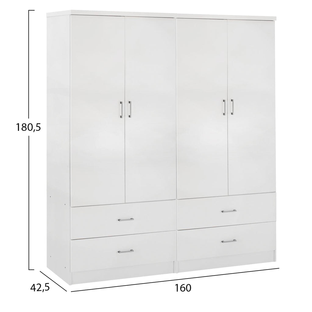 Гардероб 4-крилен REINA с 4 чекмеджета - Бял меламинов 160x42.5x180.5 см
