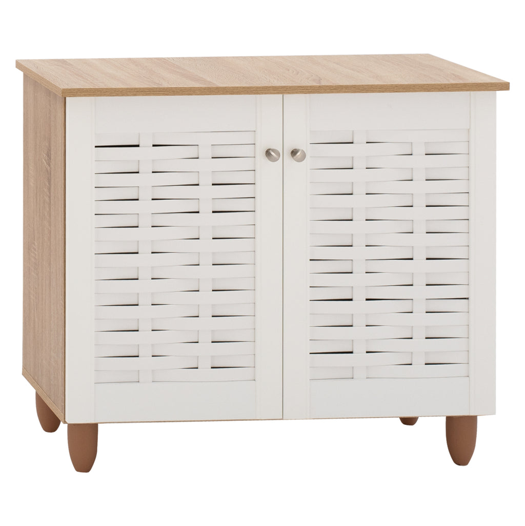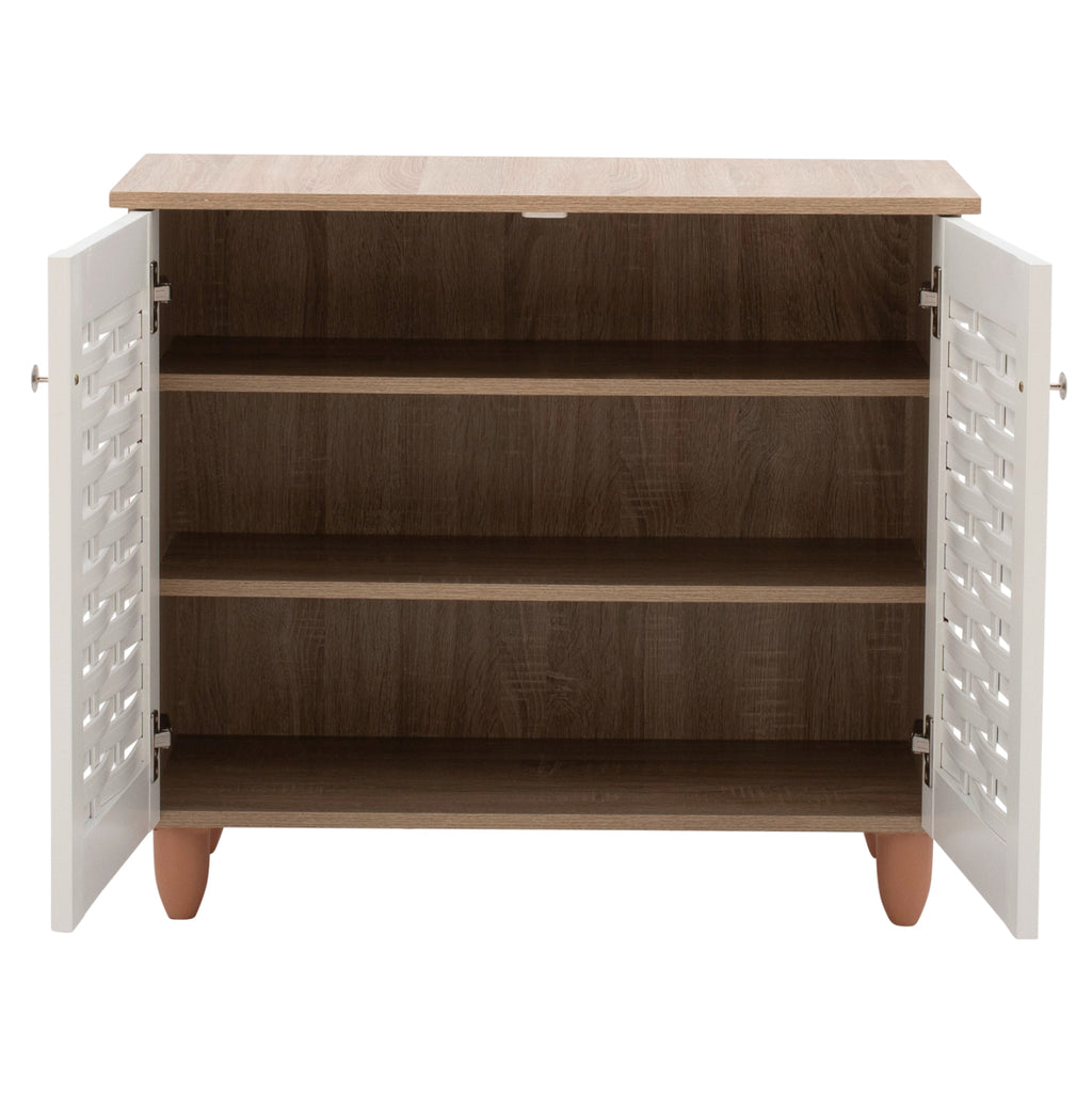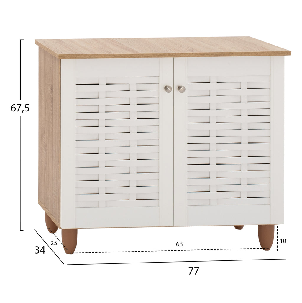 Шкаф за обувки Шкаф с 2 врати, изработен от висококачествен меламин, в цвят сонама и бяло. Шкафът за обувки има 2 рафта, 3 нива за съхранение и вдлъбнатини във вратите за вентилация на обувките ви. Размери: 77х34х67,5 см. Рафт A: 71x24x16.5 см. Рафт A: 71x24x17.5 см. Рафт A: 71x30x18.5 см. Разстояние между краката: 68х25 см. Височина на крака: 10 см. Забележки Поставката за обувки се предлага в разглобена опаковка с подробни инструкции за сглобяване.