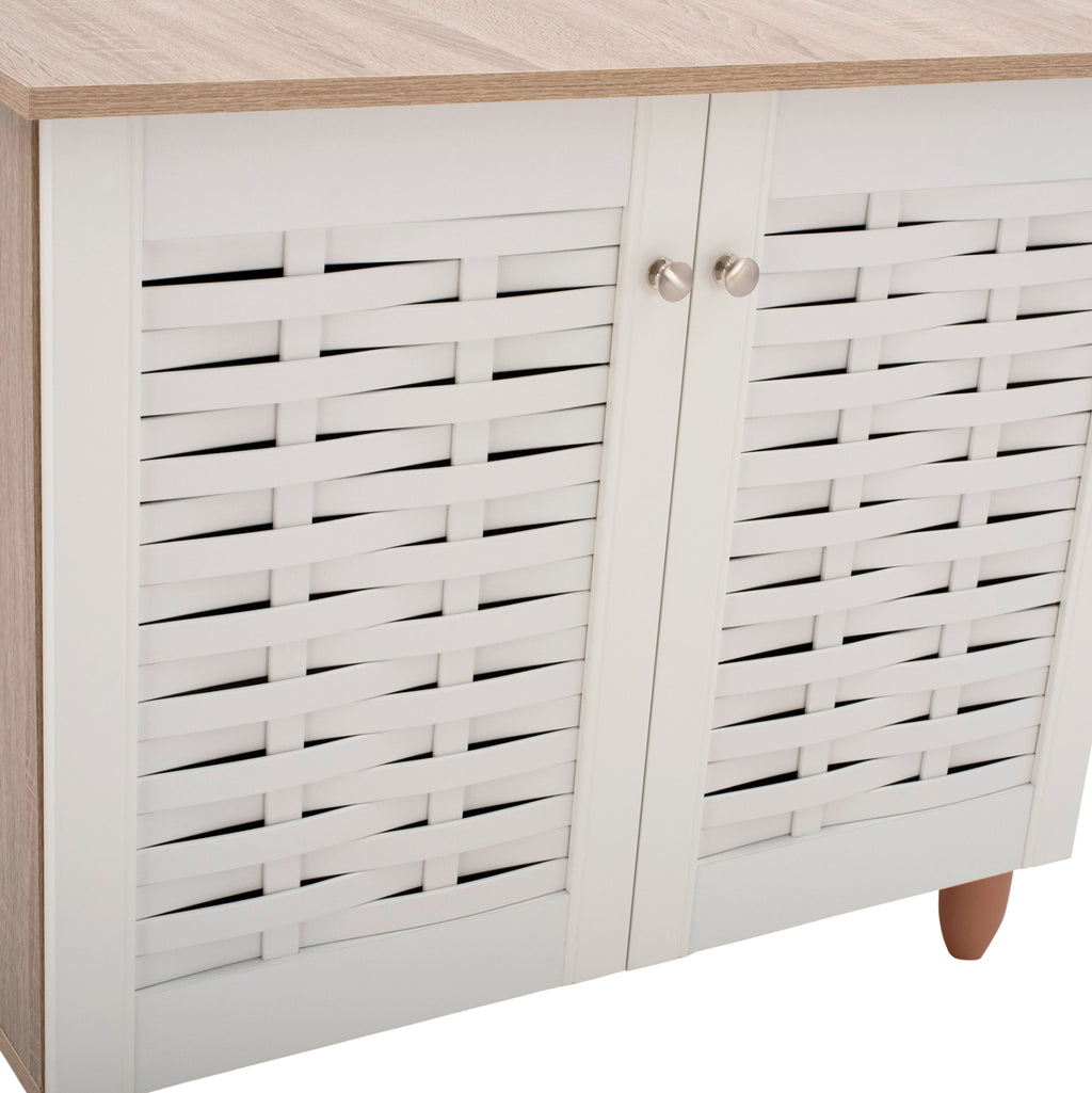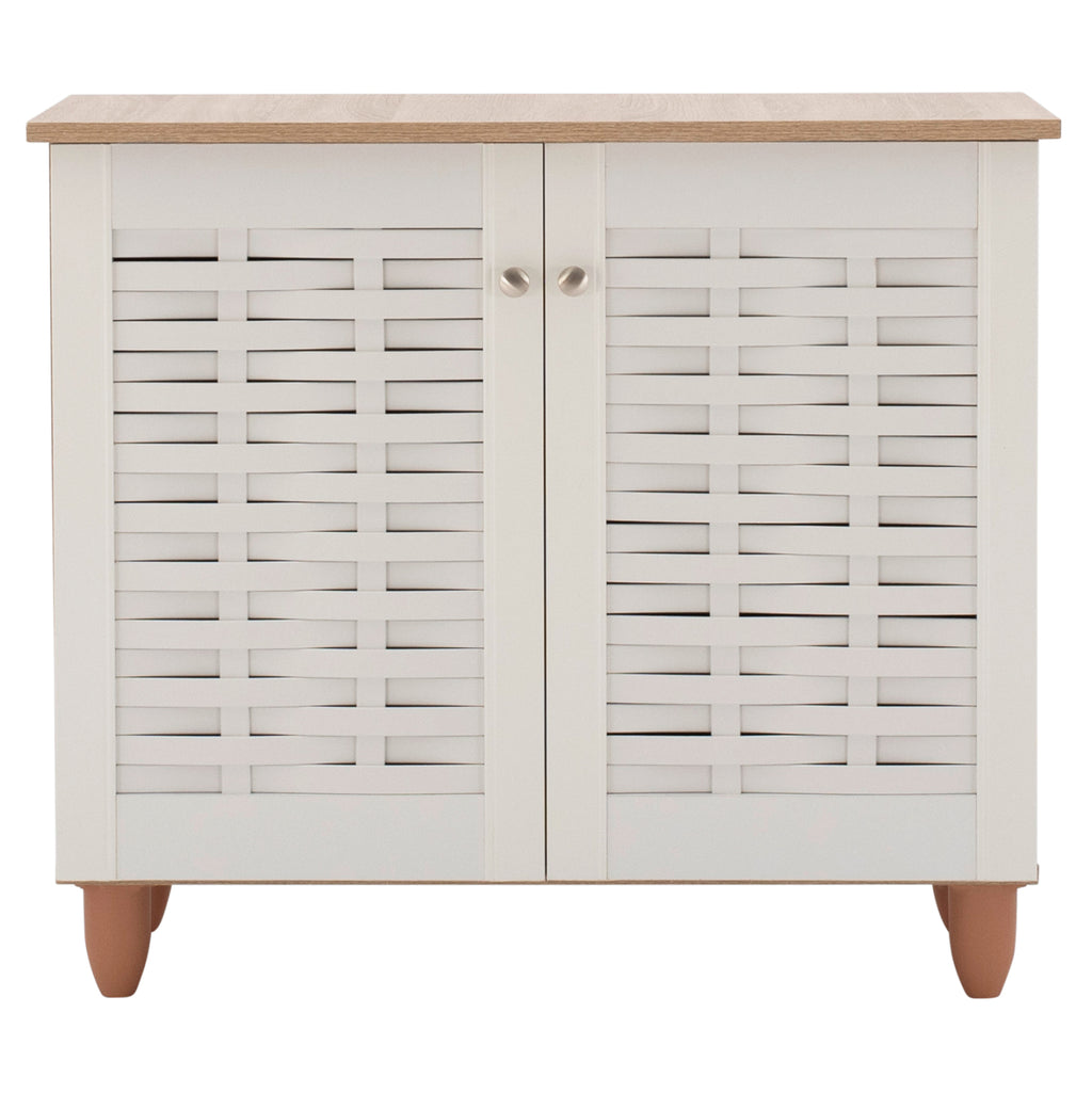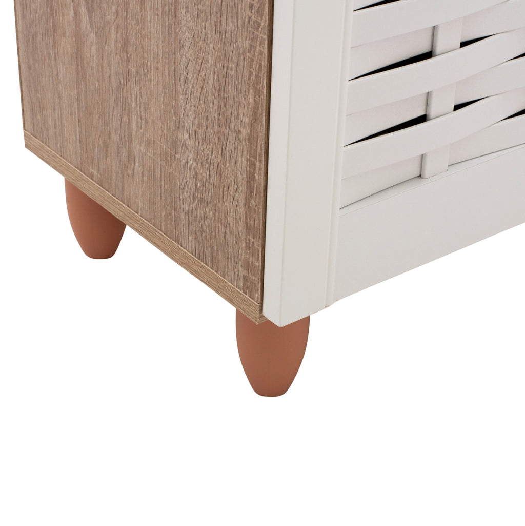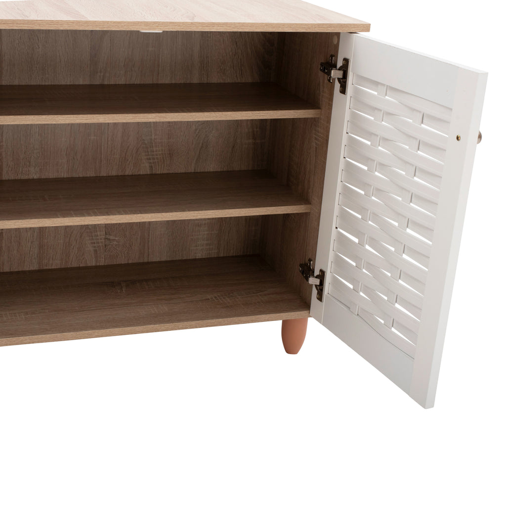 Шкаф за обувки Шкаф с 2 врати, изработен от висококачествен меламин, в цвят сонама и бяло. Шкафът за обувки има 2 рафта, 3 нива за съхранение и вдлъбнатини във вратите за вентилация на обувките ви. Размери: 77х34х67,5 см. Рафт A: 71x24x16.5 см. Рафт A: 71x24x17.5 см. Рафт A: 71x30x18.5 см. Разстояние между краката: 68х25 см. Височина на крака: 10 см. Забележки Поставката за обувки се предлага в разглобена опаковка с подробни инструкции за сглобяване.