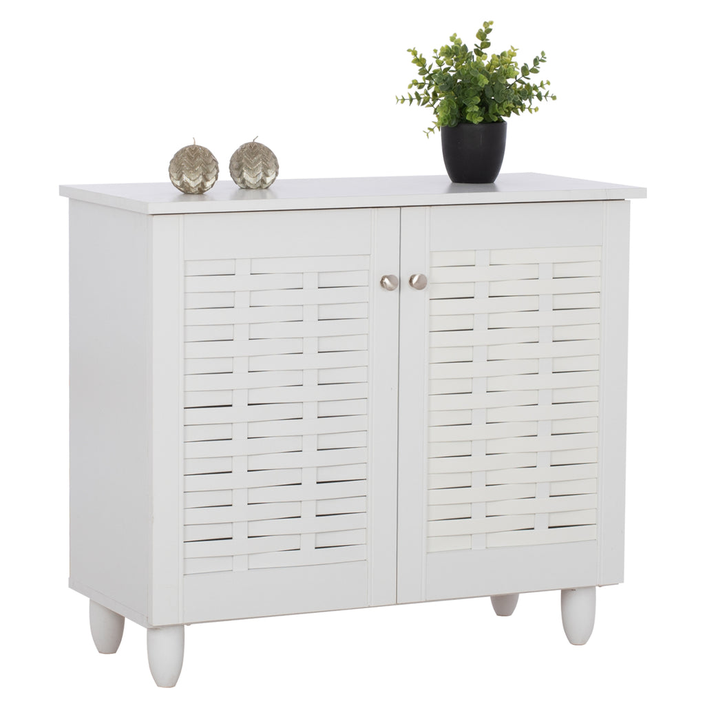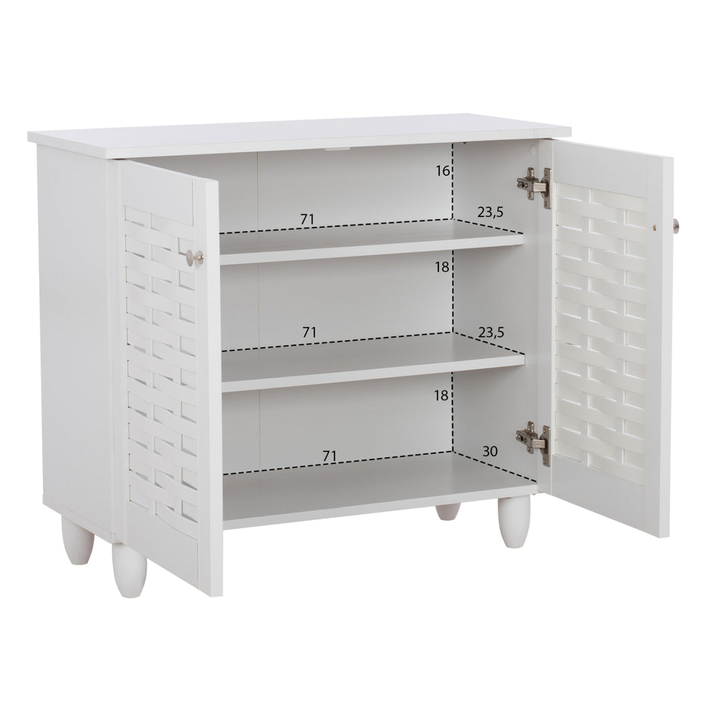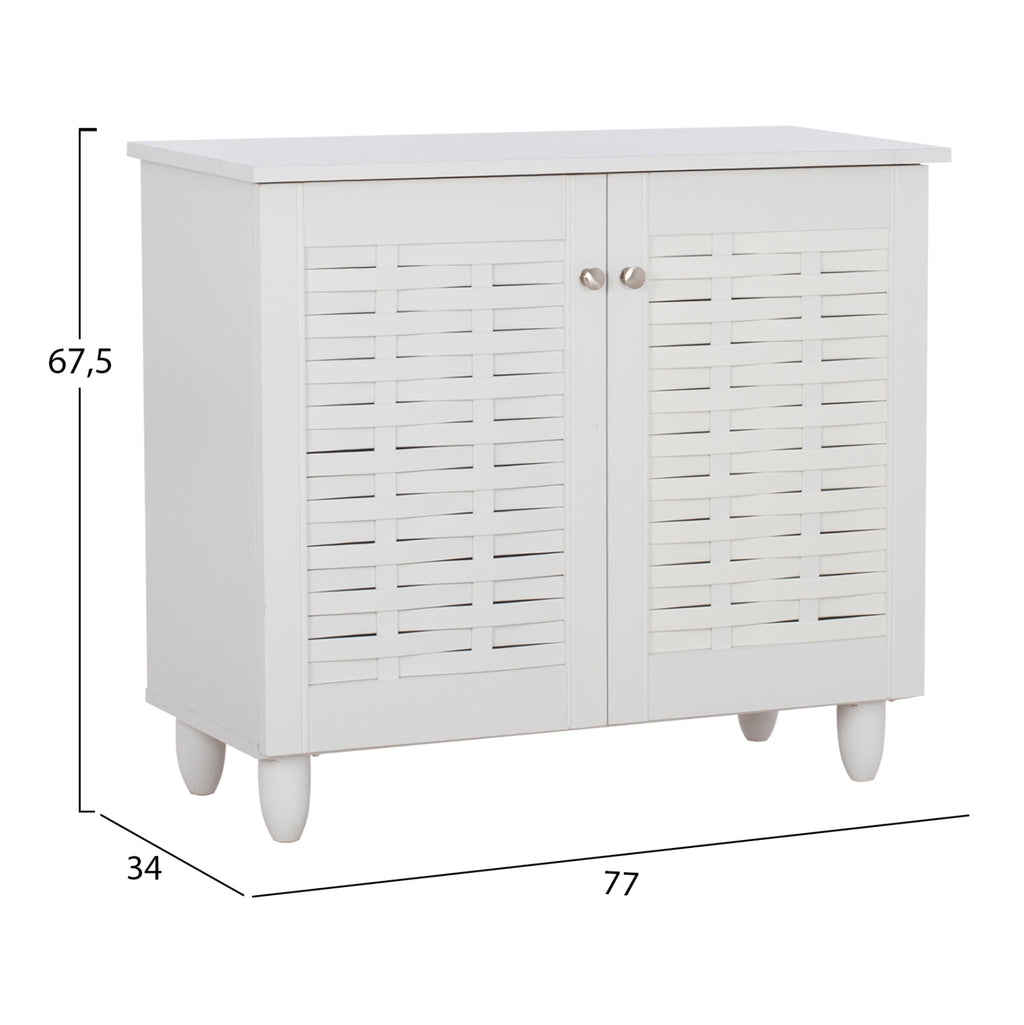 Етажерка за обувки в семпъл класически дизайн, изработена от издръжлив висококачествен меламин, в бял цвят. Има две врати и два вътрешни рафта, където те създават три места за съхранение. Също така има вдлъбнатини, за по-добра вентилация на обувките. Продукт, съчетаващ ергономичност и практичност, предлагащ място за съхранение за организиране и подреждане. Размери: 77X34X67.5см. Продуктът се предлага разглобен във фабрична опаковка.