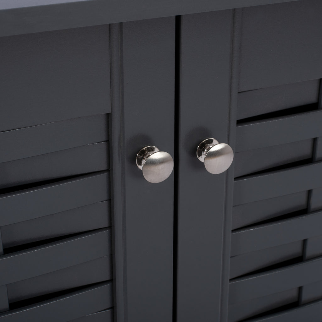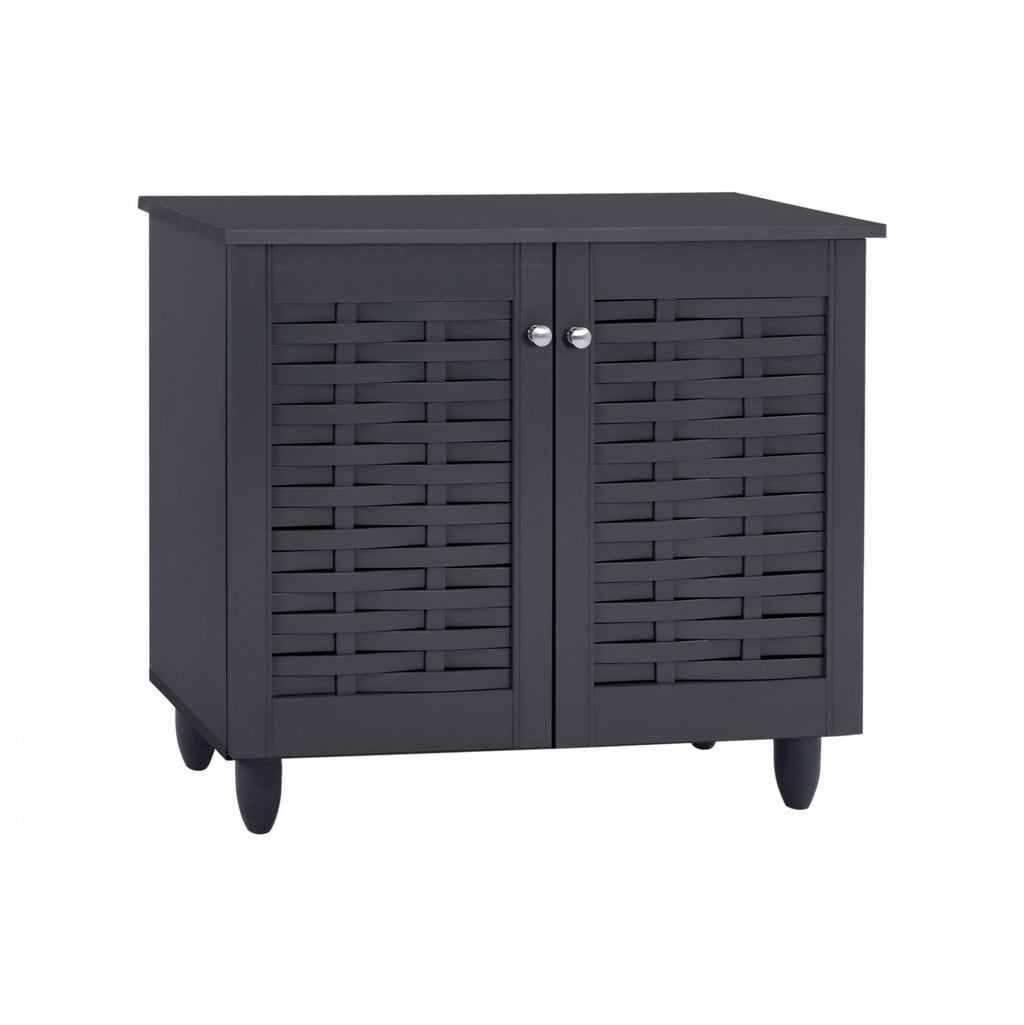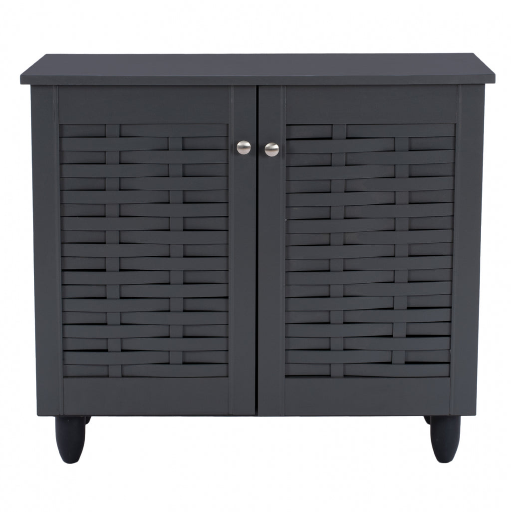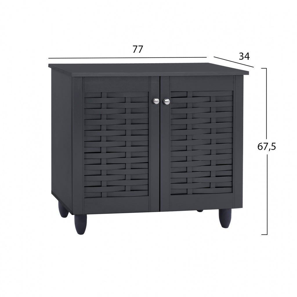 Етажерка-шкаф изработена от висококачествен меламин в сив цвят с 2 врати. Шкафът за обувки има 2 рафта, 3 нива за съхранение и вдлъбнатини във вратите за вентилация на обувките ви. Размери: 77x34x67.5 см Забележки Поставката за обувки се предлага в разглобена опаковка с подробни инструкции за сглобяване.