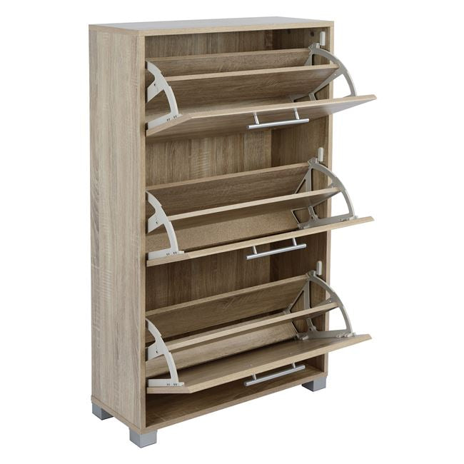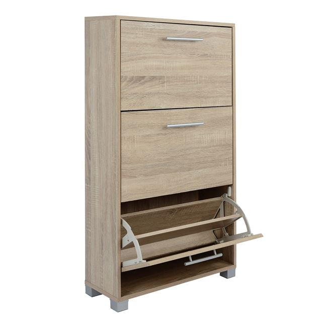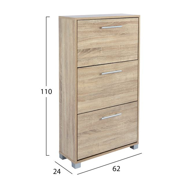 Шкафът разполага с три накланящи се отделения, които побират между 18 и 21 чифта обувки, в зависимост от техния размер и модел. Тази конструкция осигурява оптимална организация и лесен достъп до обувките, без да заема излишно място в помещението.