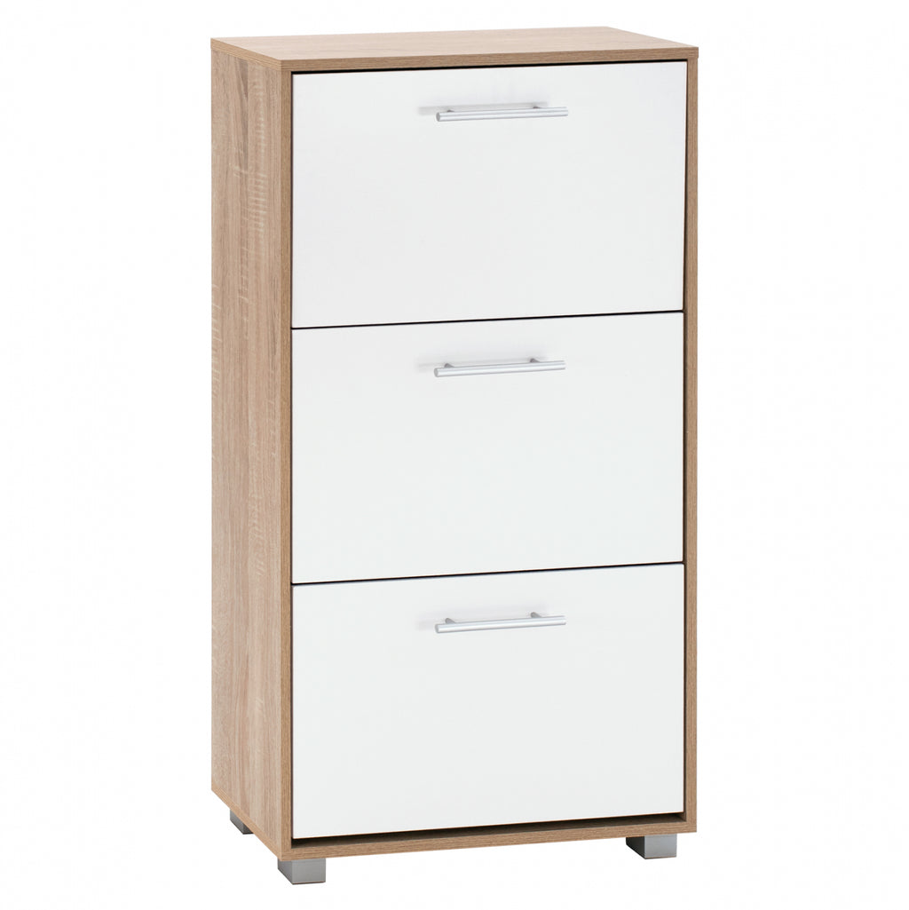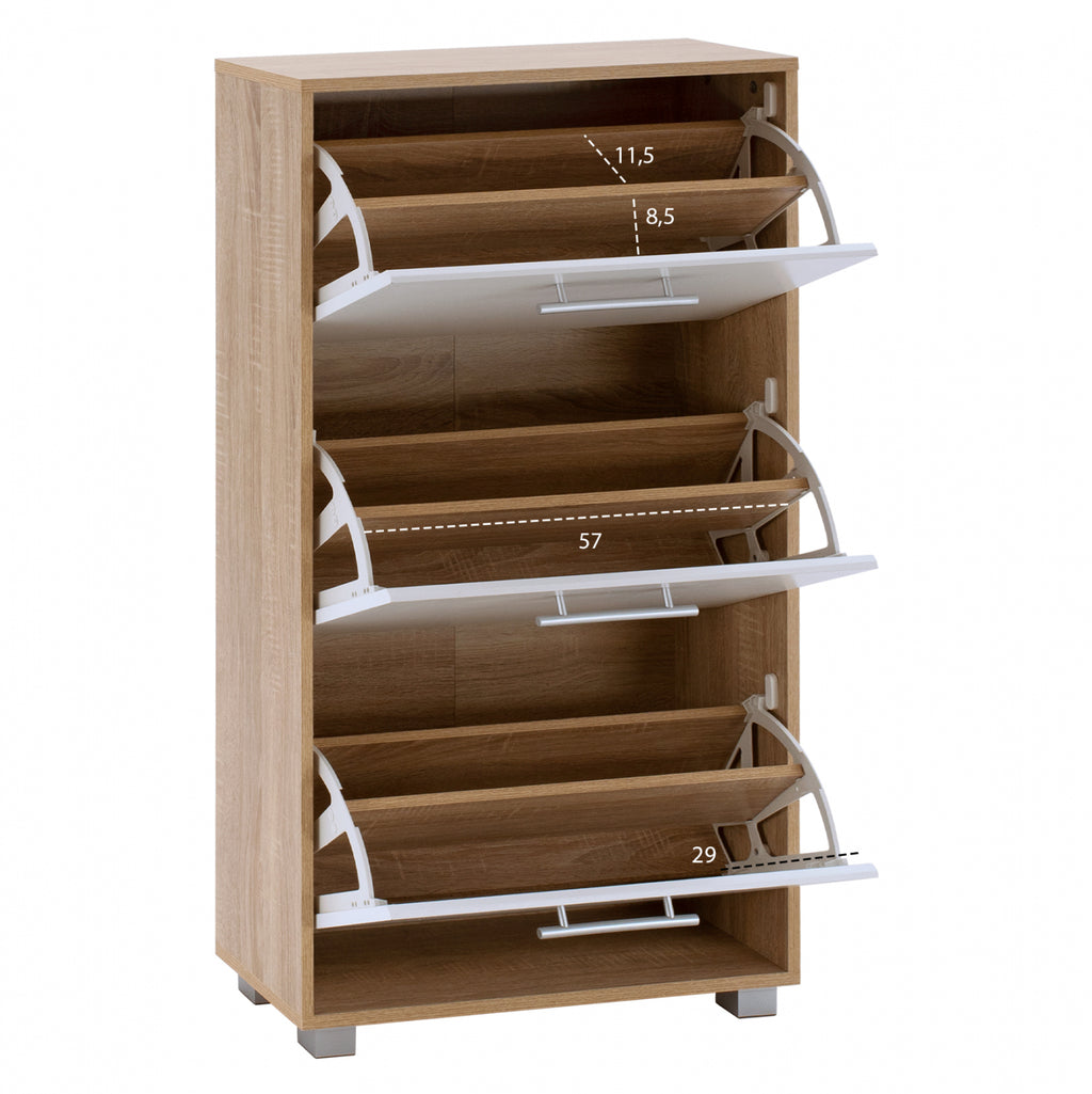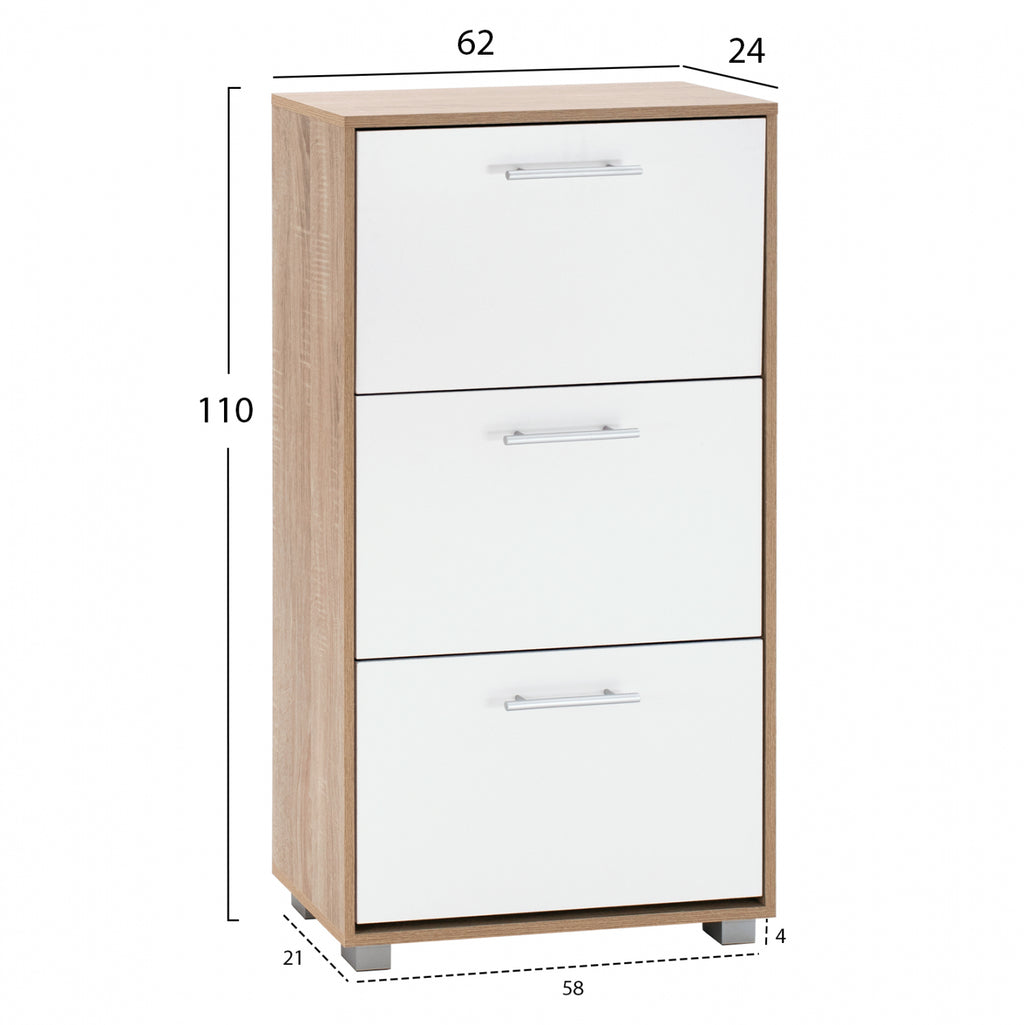 Шкаф за обувки, изработен от висококачествен меламин, с 3 накланящи се рафта за 18-21 чифта обувки, в цвят сонама и бяло с 3 врати. Четири крачета в основата на кутията за обувки за лесен достъп под нея и за предотвратяване на повреда от вода и влага. Размери: 62х24х110см. Размери на шкафа: 57х29х8,5-11,5см. Разстояние между краката: 58х21 см. Височина на крака: 4 см. Забележки Поставката за обувки се предлага в разглобена опаковка с подробни инструкции за сглобяване.