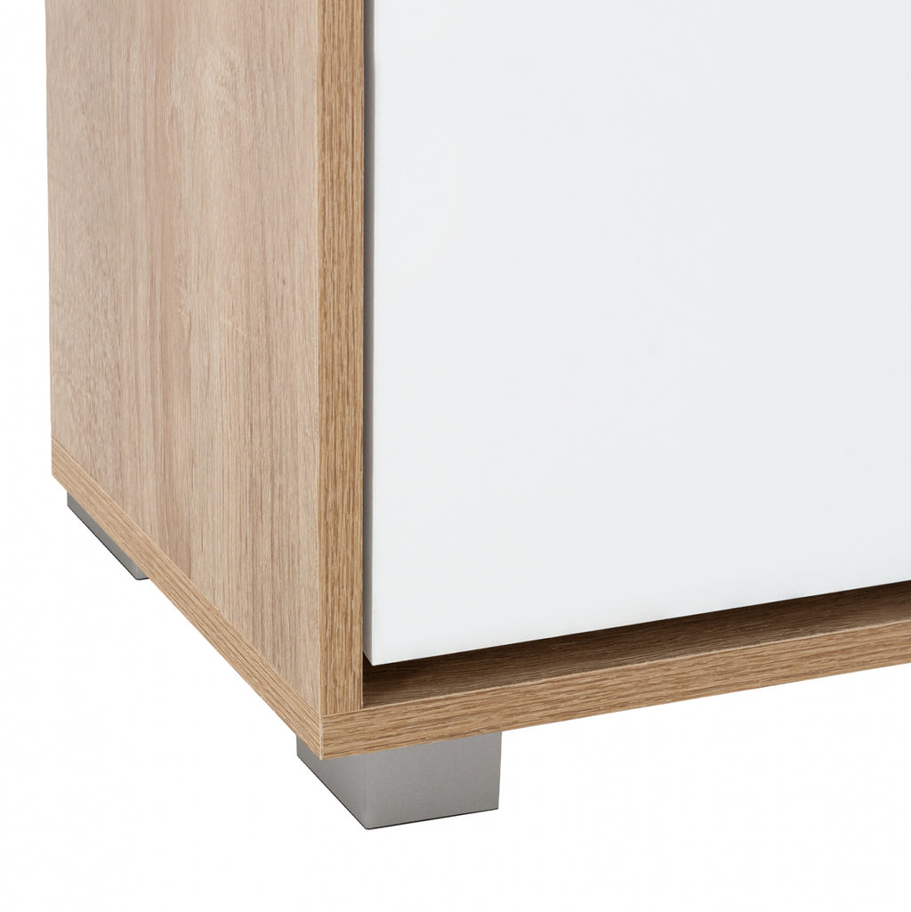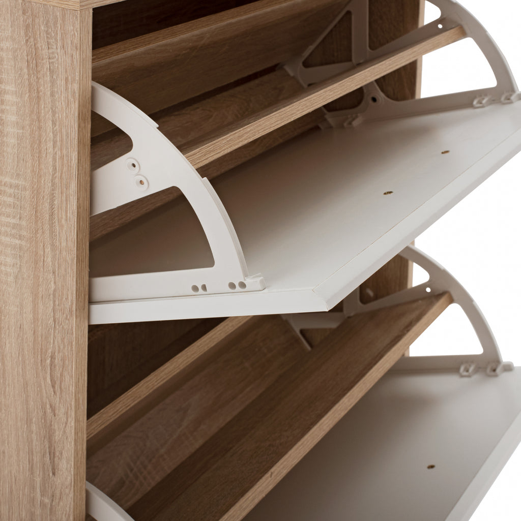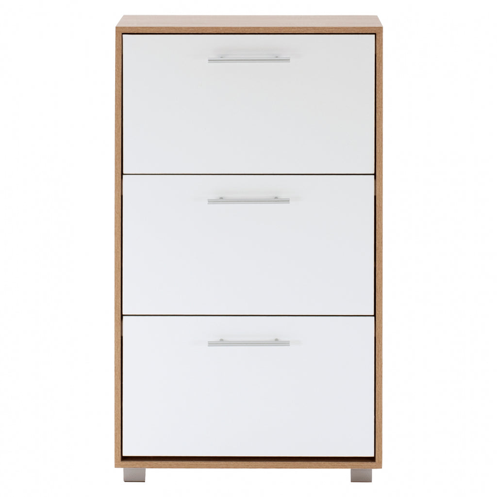 Шкаф за обувки, изработен от висококачествен меламин, с 3 накланящи се рафта за 18-21 чифта обувки, в цвят сонама и бяло с 3 врати. Четири крачета в основата на кутията за обувки за лесен достъп под нея и за предотвратяване на повреда от вода и влага. Размери: 62х24х110см. Размери на шкафа: 57х29х8,5-11,5см. Разстояние между краката: 58х21 см. Височина на крака: 4 см. Забележки Поставката за обувки се предлага в разглобена опаковка с подробни инструкции за сглобяване.