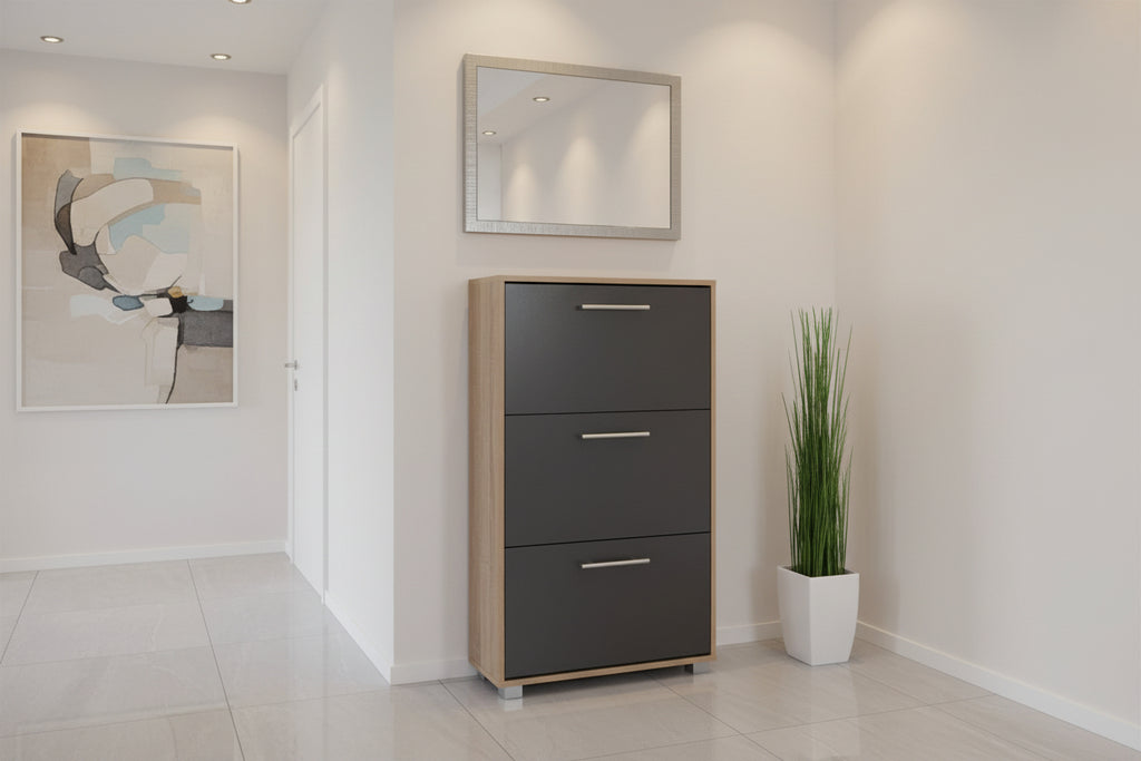 Този тънък шкаф за обувки е идеалното решение за малки антрета и тесни коридори. Със само 24см дълбочина, той пести ценно пространство, но в същото време предлага огромен капацитет за 18-21 чифта обувки. Трите накланящи се врати осигуряват лесен достъп, а всяка врата разполага с 2 рафта за оптимална организация. Четирите крака повдигат шкафа от земята, предпазвайки го от влага и улеснявайки почистването под него.