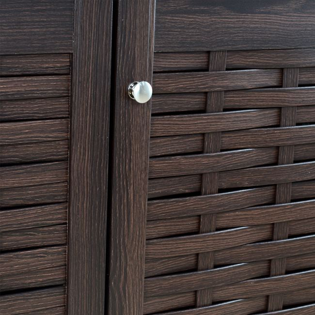 Етажерка-шкаф от висококачествен меламин в цвят бенге с 3 врати. Шкафът за обувки има 2 рафта, 3 нива за съхранение и вдлъбнатини във вратите за вентилация на обувките ви. Размери: 114х34х68см. Забележки Поставката за обувки се предлага в разглобена опаковка с подробни инструкции за сглобяване.