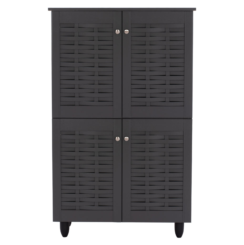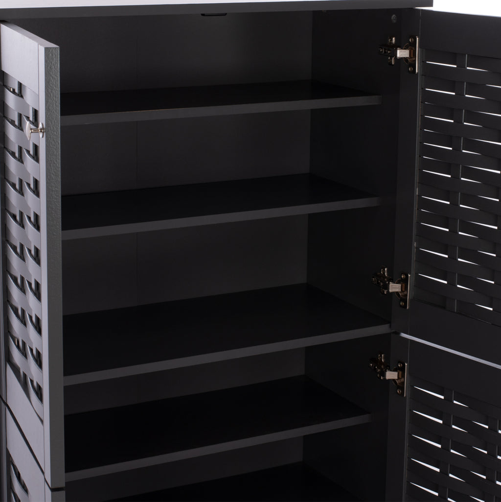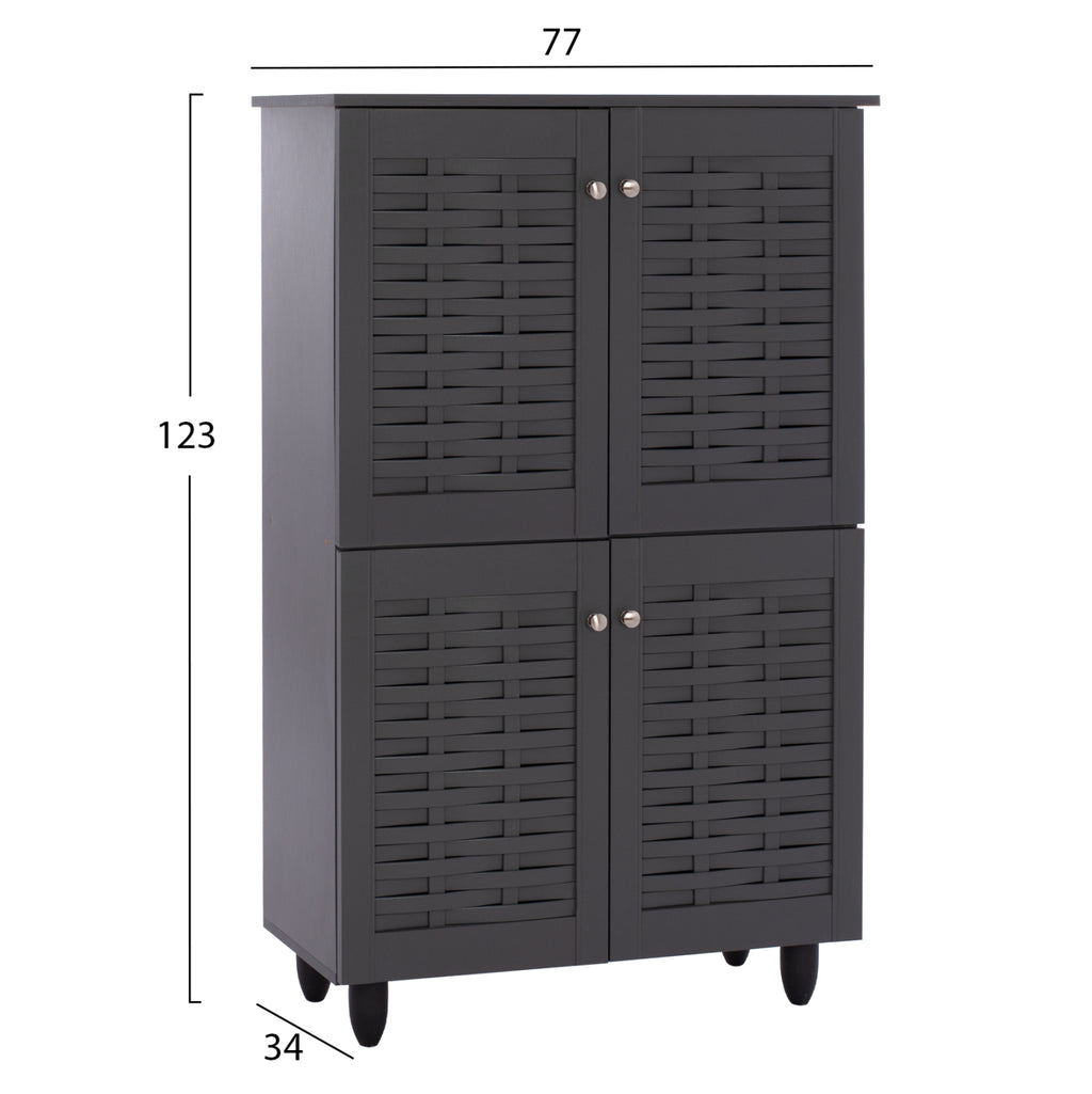 Обичате ли да сте спретнати и чисти?...това е добре, ние също. Представяме ви Шкаф-шкаф за обувки "КАБИРА" в тъмно сив цвят на две нива и 4 врати с метални кръгли дръжки. Нашата цел е да ви помогнем да организирате и подобрите функционалността на вашия дом по възможно най-добрия начин. ТЕХНИЧЕСКИ ХАРАКТЕРИСТИКИ: Габаритни размери: 77x34x123H cm. Размери на рафтовете: 71x24x16 см. (x3) 71x24x17 см. 71x24x18 см. МАТЕРИАЛ ЗА ИЗРАБОТКА: Шкафът за обувки е изработен изцяло от меламин. Меламинът е синтетичен материал, много издръжлив и под формата на листове, които след това се превръщат в ПДЧ чрез пресоване. Краката на кутията за обувки са изработени от пластмаса за специална устойчивост на вода и време. Кутията за обувки е лесна за поддръжка. Изработен е от меламин и се почиства лесно с влажна кърпа в ъгъла на гардероба, водата ще повреди меламина. ПРЕДИМСТВА: Поставката за обувки е красива и функционална, тъй като има 4 врати за по-лесен достъп до интериора. Освен това вратите имат плетен дизайн, който допринася за правилната и необходима вентилация на рафта за обувки, този конкретен гардероб също е красив. Неговият цвят и общ дизайн със сигурност ще привлекат вниманието и ще принудят много хора да го включат в списъка си с желания. **Продуктът се доставя в несглобен вид с подробна инструкция за сглобяване
