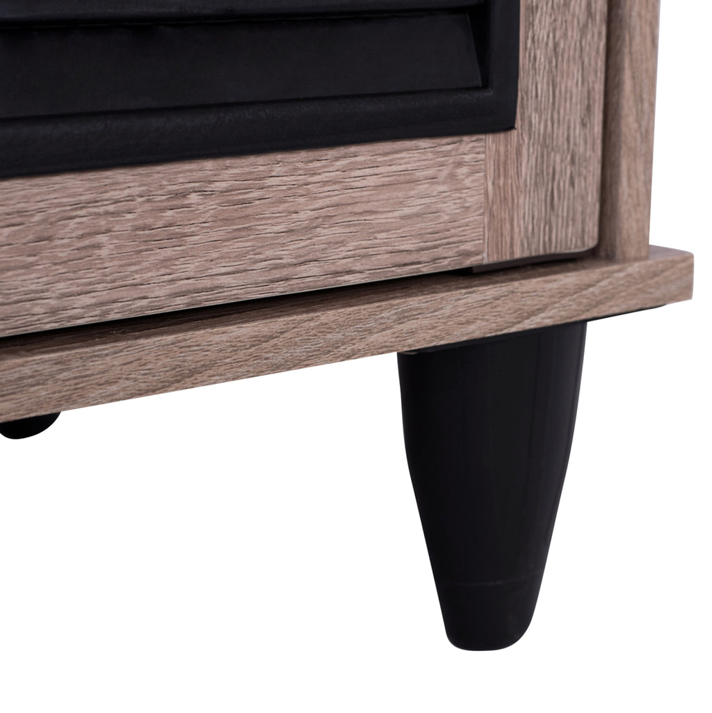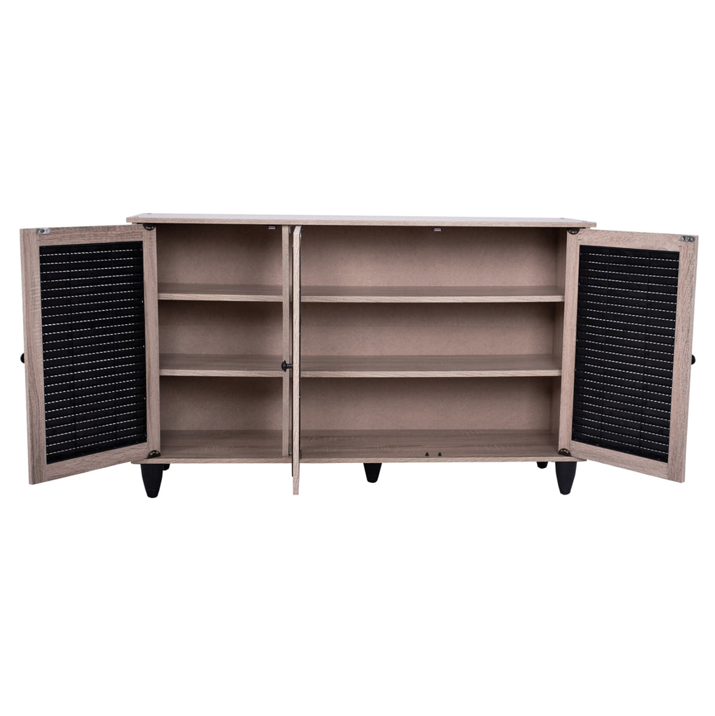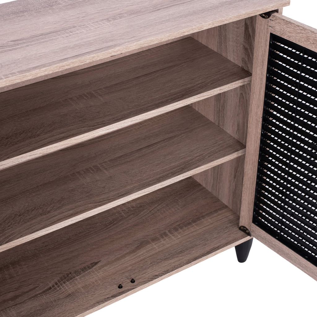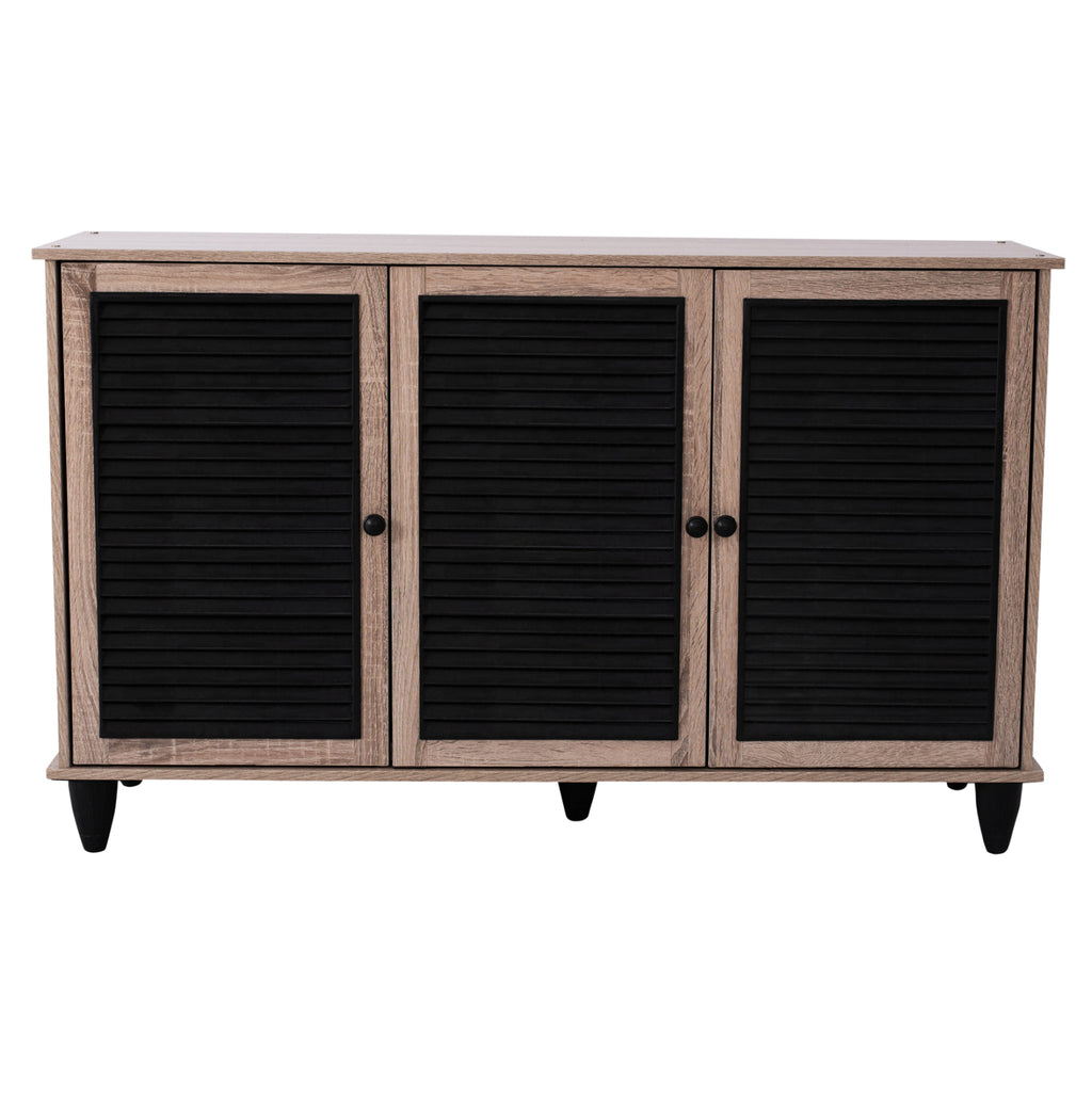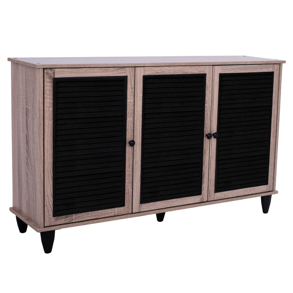 Шкаф за обувки Шкаф изработен от висококачествен меламин в цвят сонама - черен с 3 врати. Шкафът за обувки разполага с 2 рафта, 3 нива за съхранение и полиетиленови решетки на вратите за проветряване на обувките. Размери: 112x30x68.5H см. Забележки: Поставката за обувки се предлага в разглобен вид с подробна инструкция за сглобяване.