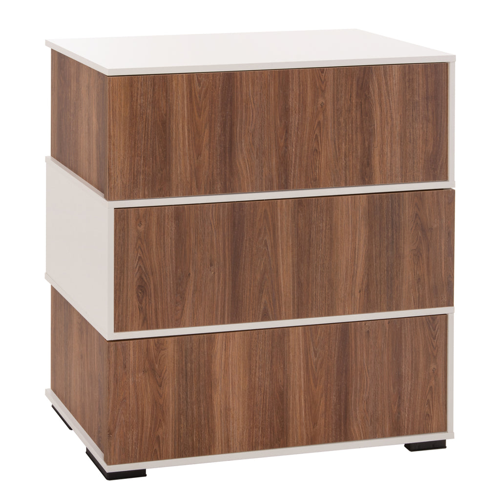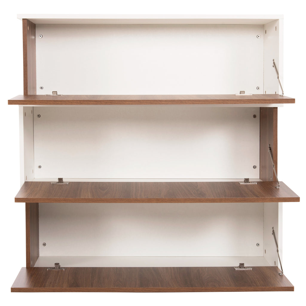 Обичате ли да сте спретнати и чисти? Представяме ви меламинова поставка за обувки MIRABELL в цвят орех с бели детайли, на 3 нива. Вратите се отварят надолу и обувките се поставят на един рафт на ниво. Опира се на 4 ниски черни крака, за да предотврати повреда от вода и влага.