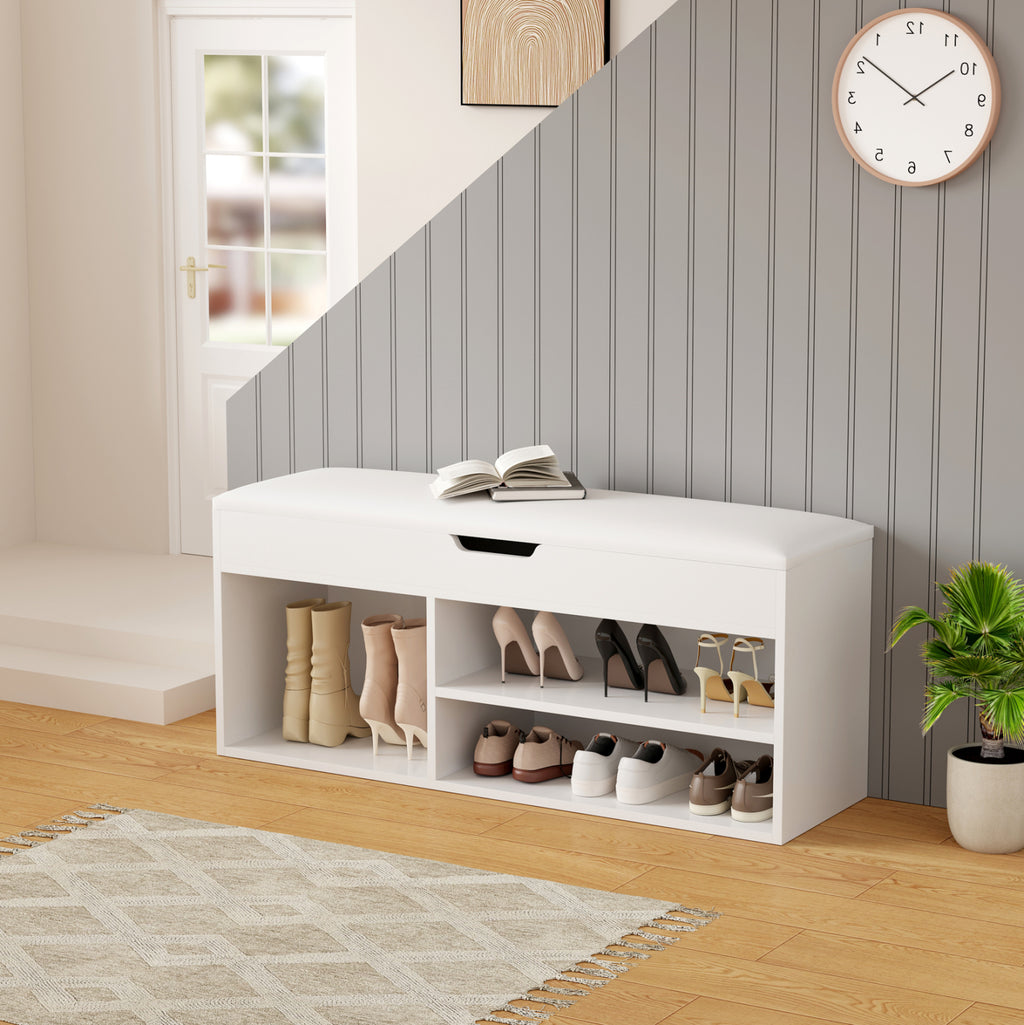 Шкафът за обувки ROMIR е изключително функционален. Разполага с удобна седалка, покрита с висококачествена PU кожа в бял цвят, която осигурява комфорт, докато обувате или събувате обувките си. Под повдигащата се седалка има допълнително отделение, подходящо за съхранение на дребни аксесоари, ключове или почистващи средства за обувки.