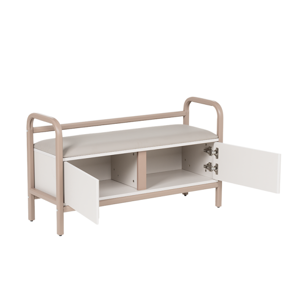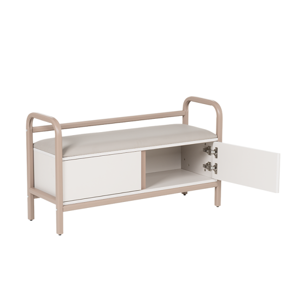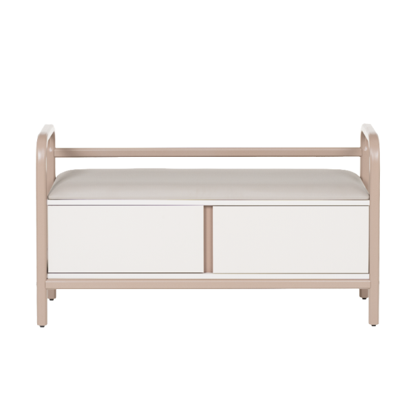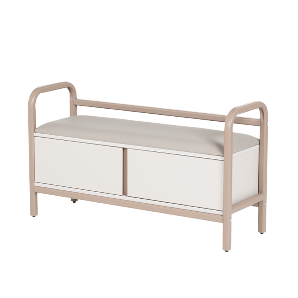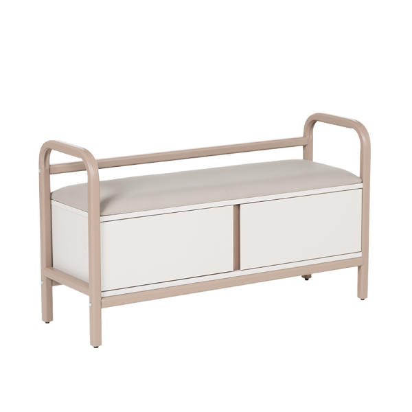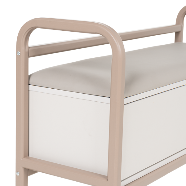 Шкаф за обувки с пейка BALABAC – стилно и практично решение за малки антрета. Моделът съчетава удобна седалка тапицирана с мека еко кожа и две шкафчета за съхранение. Конструкцията е от метал, а корпусът – от ПДЧ с меламиново покритие, което осигурява лесна поддръжка и устойчивост.