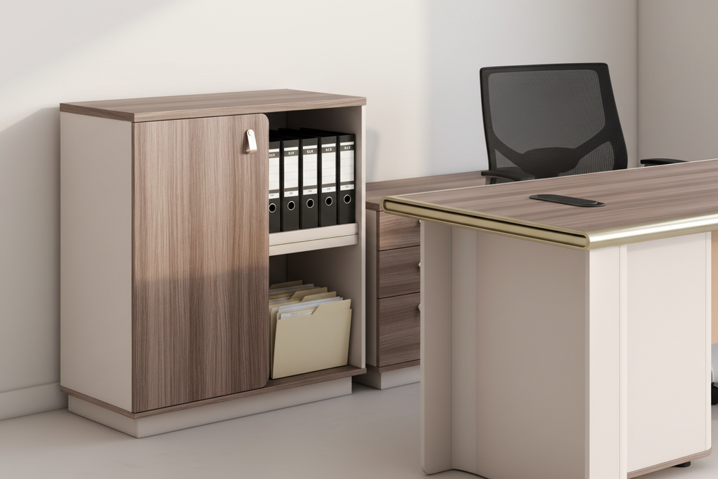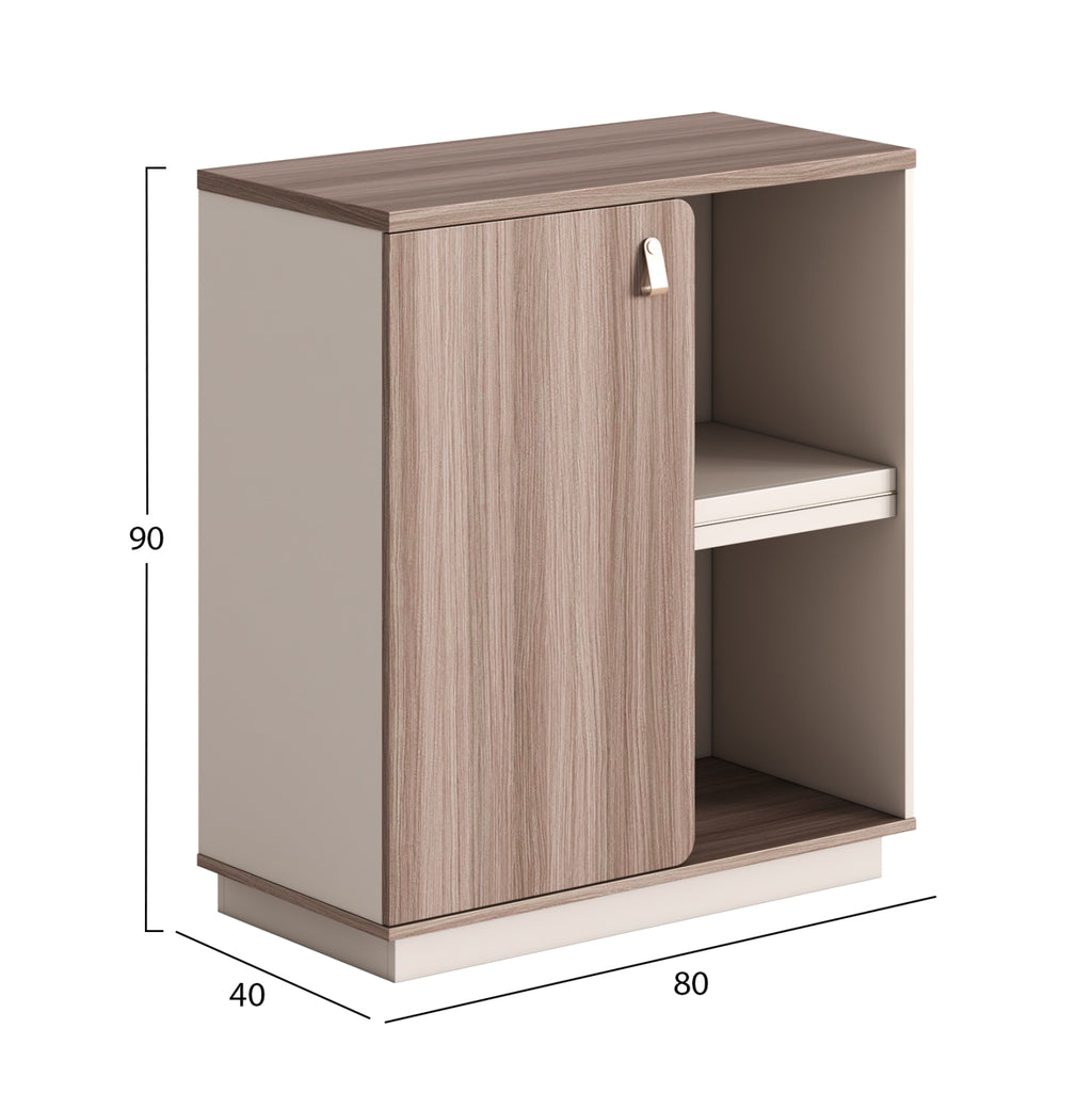 Офис шкафа от серията SUPERON е практично и стилно решение за съхранение в офиси и професионални пространства. Комбинацията от меламин в бежово с натурален цвят създава модерен ефект, който лесно се интегрира във всяка офис среда. Лявата страна има шкаф, а дясната страна се състои от отворено пространство за съхранение тип библиотека с 2 рафта, предлагащо незабавен достъп и гъвкавост при използване.
