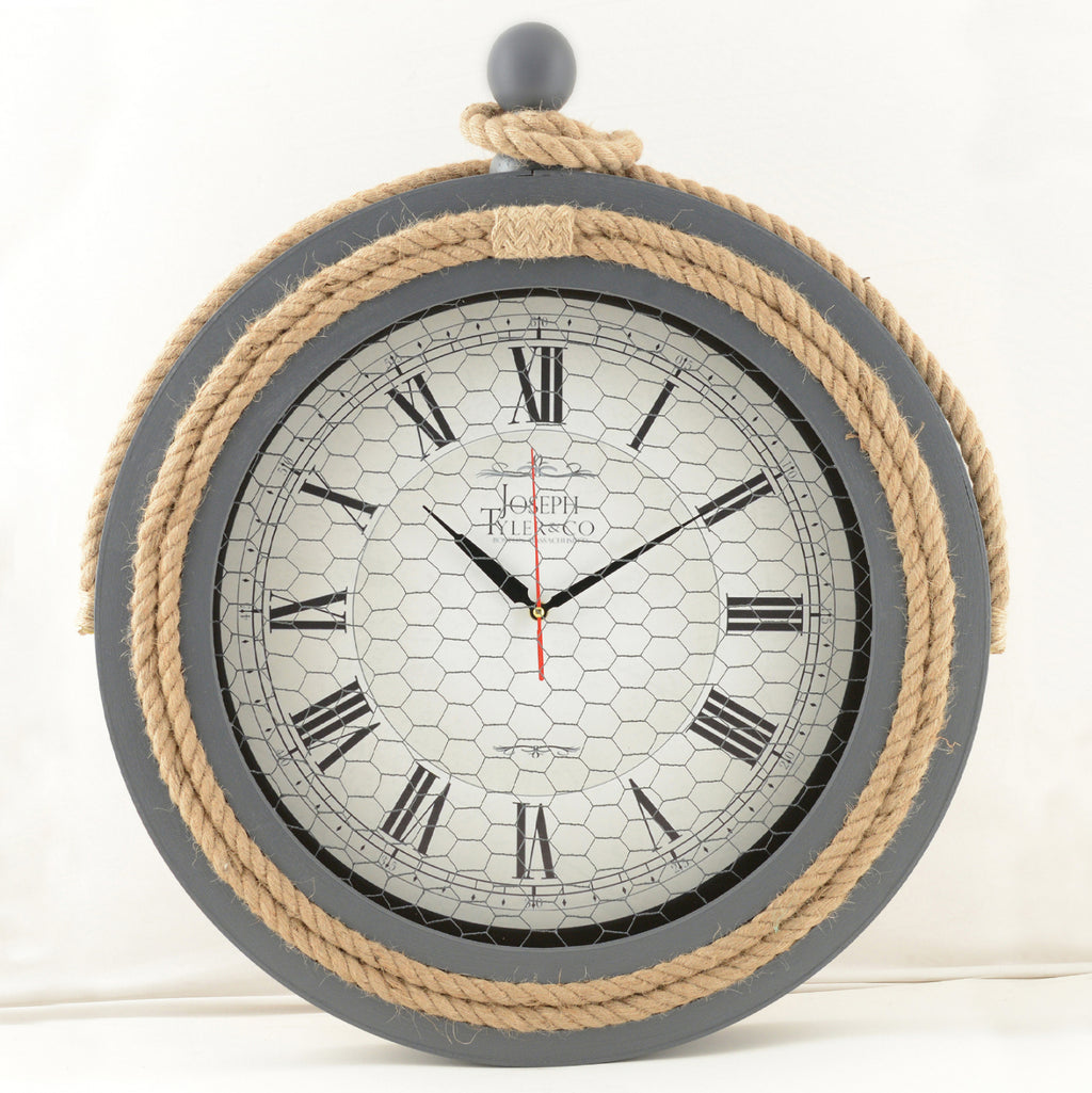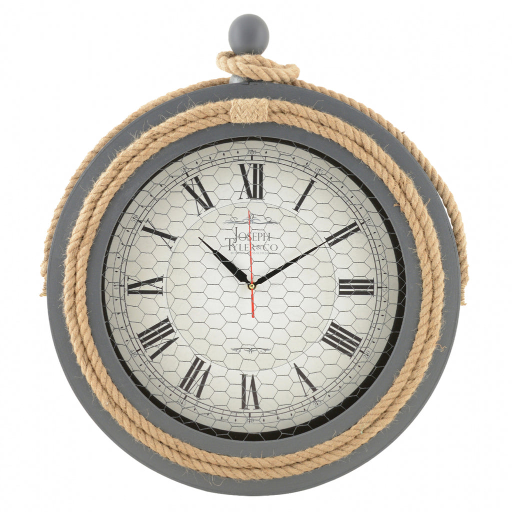 Стенен часовник в сиво с въже и метална мрежа. Можете да декорирате стената си с часовник с несравнима естетика и високо качество. Той е перфектният подарък, който да се впише в декорацията на офиса, дома и всяко интериорно пространство (с изключение на банята). Изработен от MDF, като стрелките също са от метал. Специална характеристика на часовника е безшумният му механизъм. Батерията не е включена в комплекта. Продуктът е разположен на 2,5 см от стената. Може лесно да се закрепи с един пирон. Размери: Φ50 см.