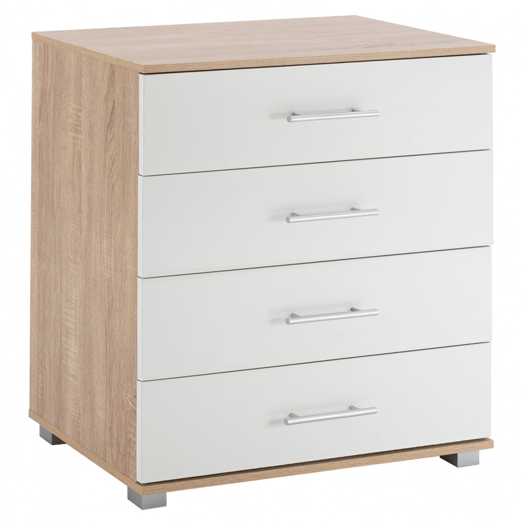 Модерен скрин от меламин в нюанс сонама с бели чекмеджета. Разполага с четири просторни чекмеджета за поставяне на вашите лични вещи. Добавете модерен стил към дома си и оставете всички останали без думи. Размери: 75x40x83Y см. Размери на чекмеджето: 66x31x13Y см. (x4) Размери на крака: 72x36.5см. Височина на крака: 4 см. Продуктът се предлага разглобен в опаковка.