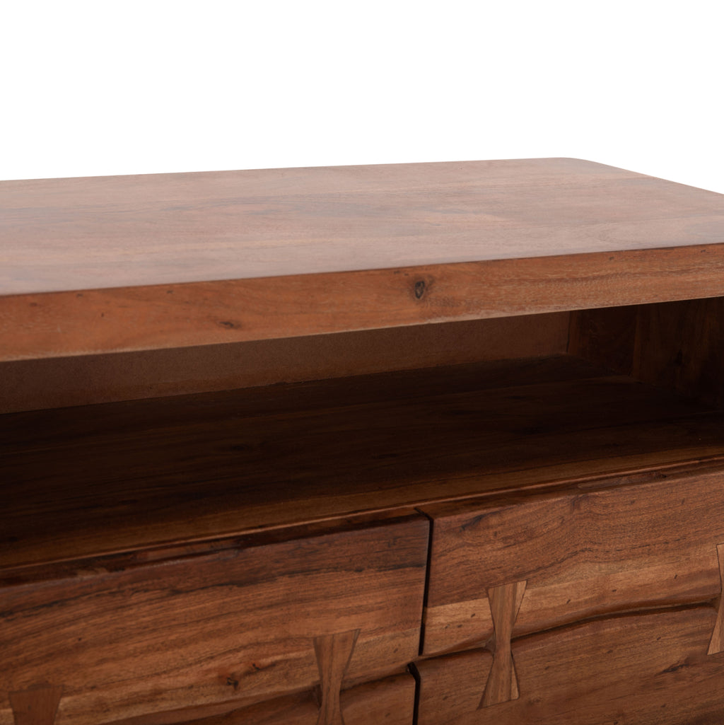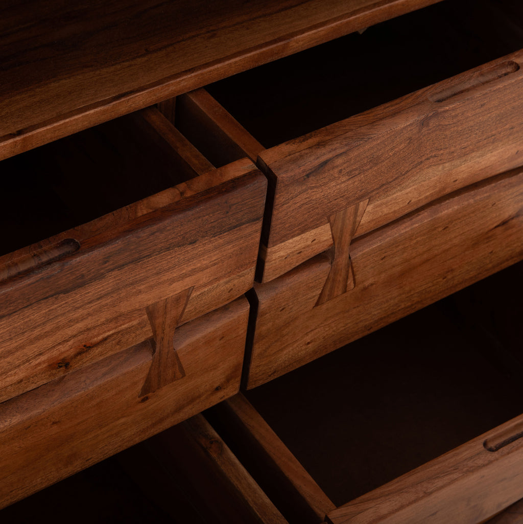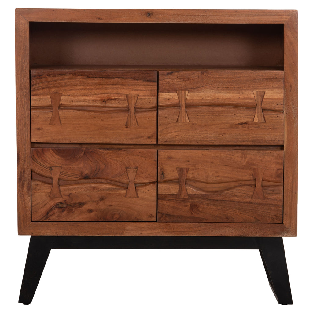 Открийте уникалния ръчно изработен скрин КГ8474.11 от естествено масивно акациево дърво! Като специална характеристика, фронтовете на чекмеджетата са обработени, за да създадат оригиналния характер и естественото впечатление на резен от огромно дърво. Ръчно изработен скрин от масивно акациево дърво в естествен нюанс и метални крака в черно. Има 3 големи чекмеджета за съхранение на вашите неща. Вечна мебел, която издържа изпитанието на времето, с отлично покритие, вдъхновено от природата, където дървото играе водеща роля. Размери: 80х35.5х86.5см. Забележка: Продуктът е изработен от естествено масивно акациево дърво и всеки е уникален поради неравностите на стволовете. Съществуващите пукнатини или тези, които могат да се образуват с течение на времето се дължат на свиването-разширяването на живия организъм, наречен масивна дървесина, а не са производствен дефект, придавайки оригиналност и уникален дизайн на вашето пространство. По време на производствения процес съществуващите пукнатини се изглаждат и стабилизират с материал от същата дървесина. Поради това може да има цветови вариации и разлики в размерите на продукта поради размерите на обработената дървесина. Това не са дефект на продукта.
