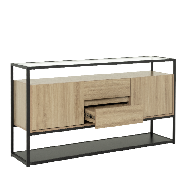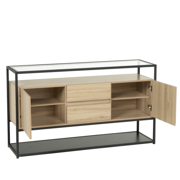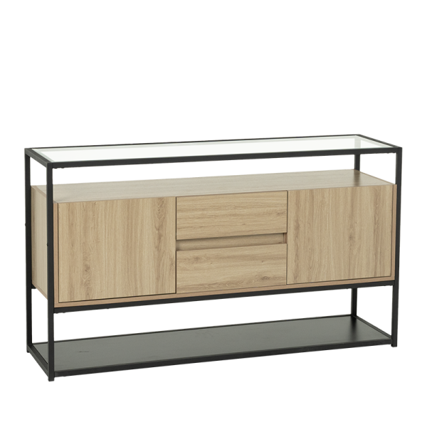 Скрин GAVLE впечатлява с елегантна линия и модерна комбинация от материали. Здрава метална рамка с черно праховобоядисано покритие рамкира корпус от 15 мм МДФ с меламиново покритие в топъл дървесен нюанс. Моделът разполага с 2 чекмеджета и 2 шкафа с рафтове, а горният плот от закалено стъкло придава допълнителна лекота и изисканост.