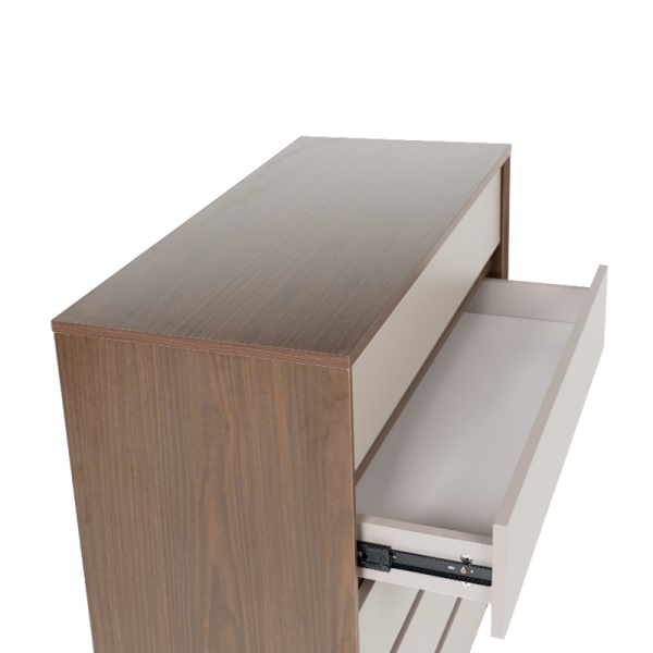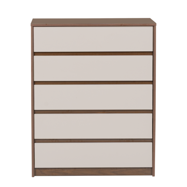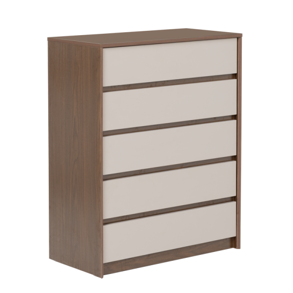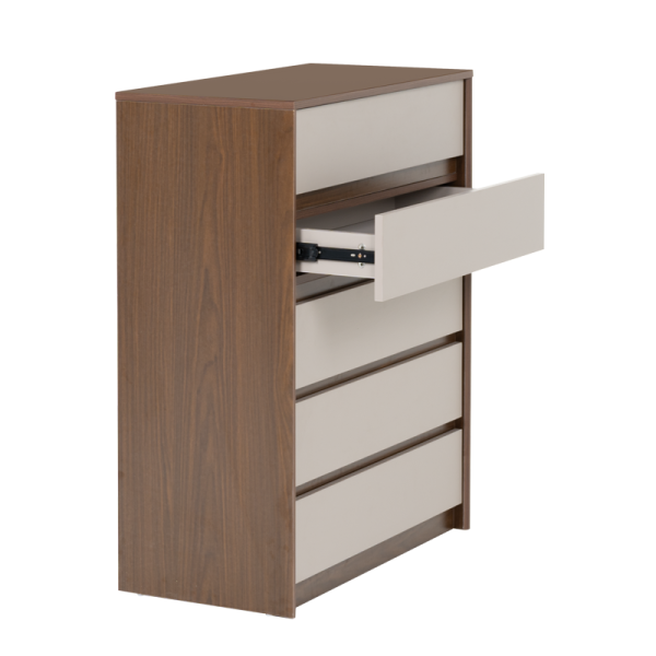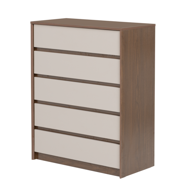 Скрин LIBERTAD съчетава елегантна визия с практичност – разполага с 5 широки чекмеджета за удобно съхранение на дрехи, аксесоари и други вещи. Изчистеният му дизайн и топлата комбинация от дървесен декор и неутрални фронтове го правят подходящ за различни интериори.
