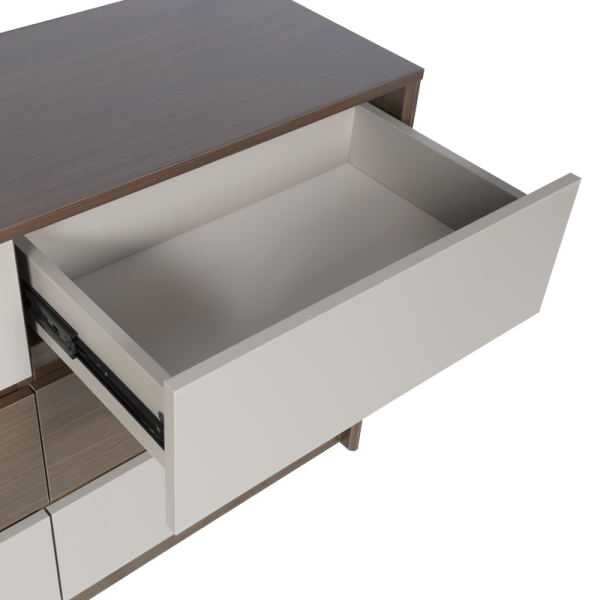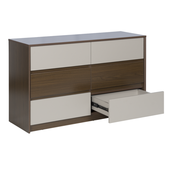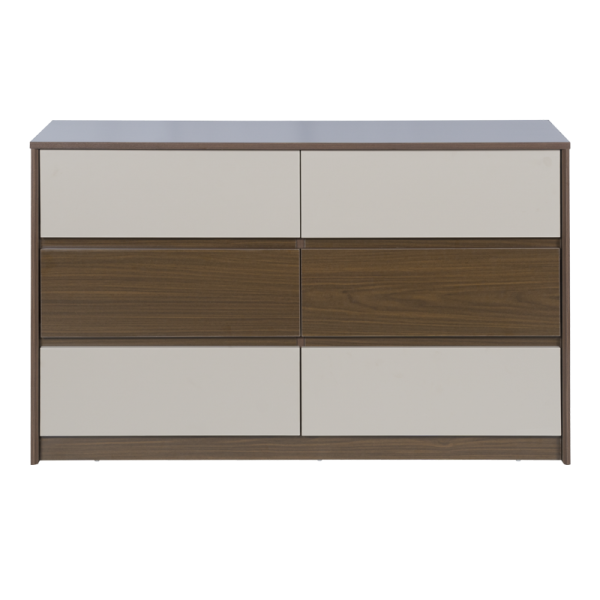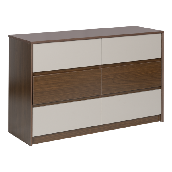 Скрин NAVOTAS е стилно и практично решение за съхранение, което впечатлява с изчистен дизайн и модерно цветово съчетание. Разполага с шест удобни чекмеджета, осигуряващи достатъчно място за подредба на дрехи и аксесоари. Елегантната комбинация между топъл дървесен цвят и нюанс капучино придава уют и хармония на всяко помещение.